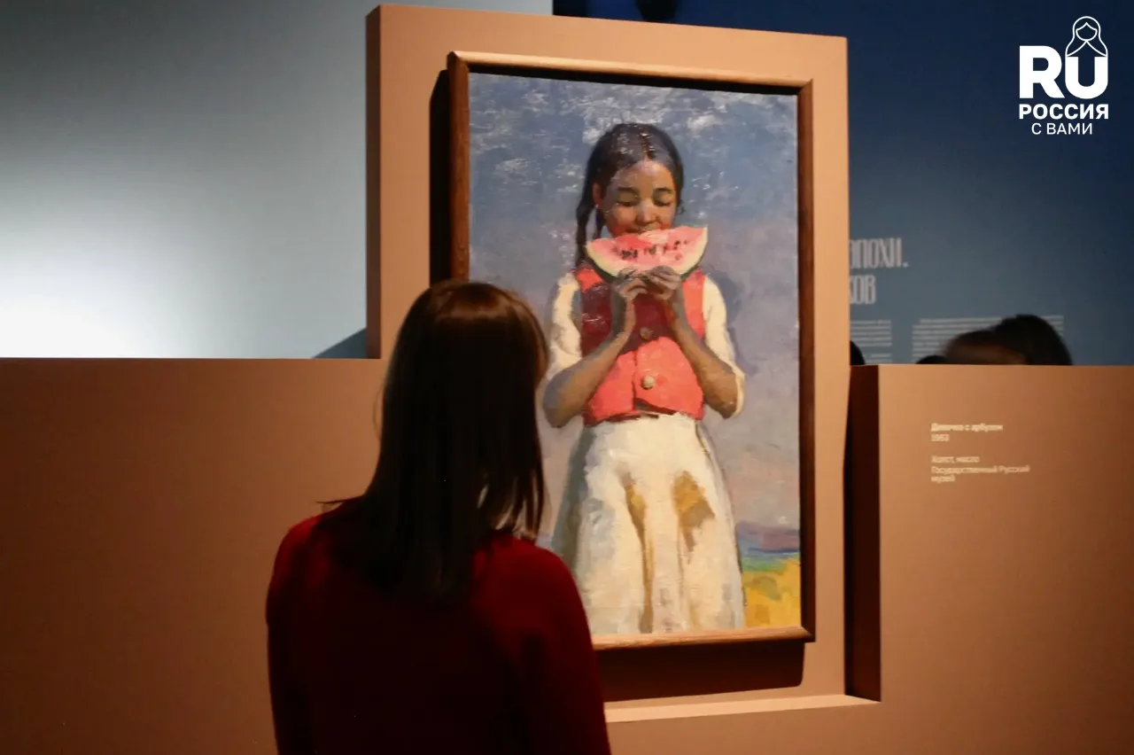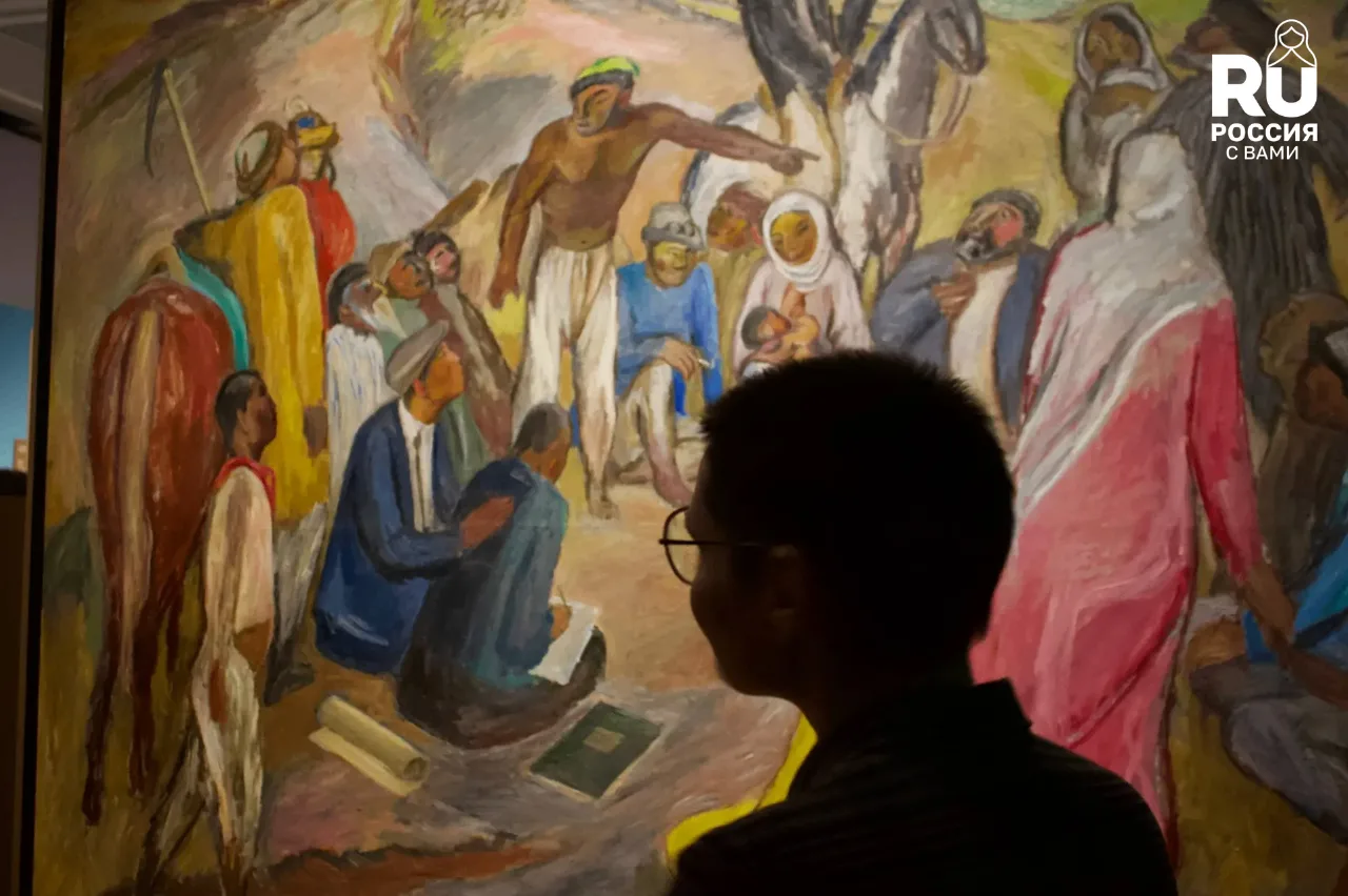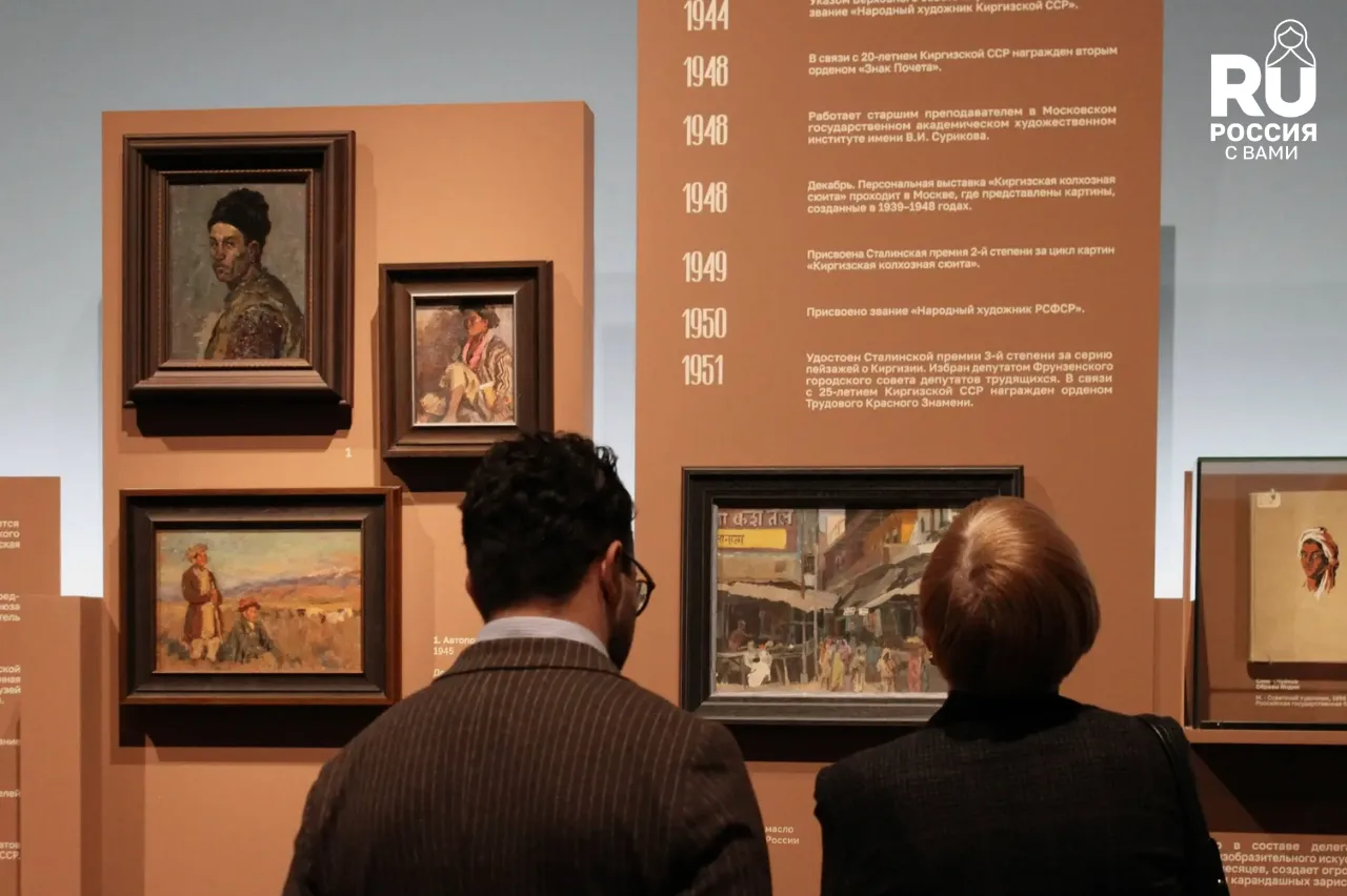 🖼 Кураторы собрали более 50 живописных работ из Третьяковской галереи, Русского музея, национального музея им. Гапара Айтиева, а также архивные материалы из фондов РОСИЗО, Госархива и ТАСС.