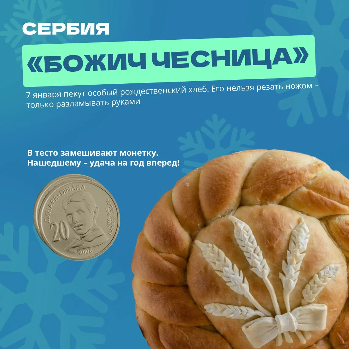 В Сербии за столом преломляют «чесницу» — хлеб с монеткой внутри. Кому достанется — тому благословение на целый год.