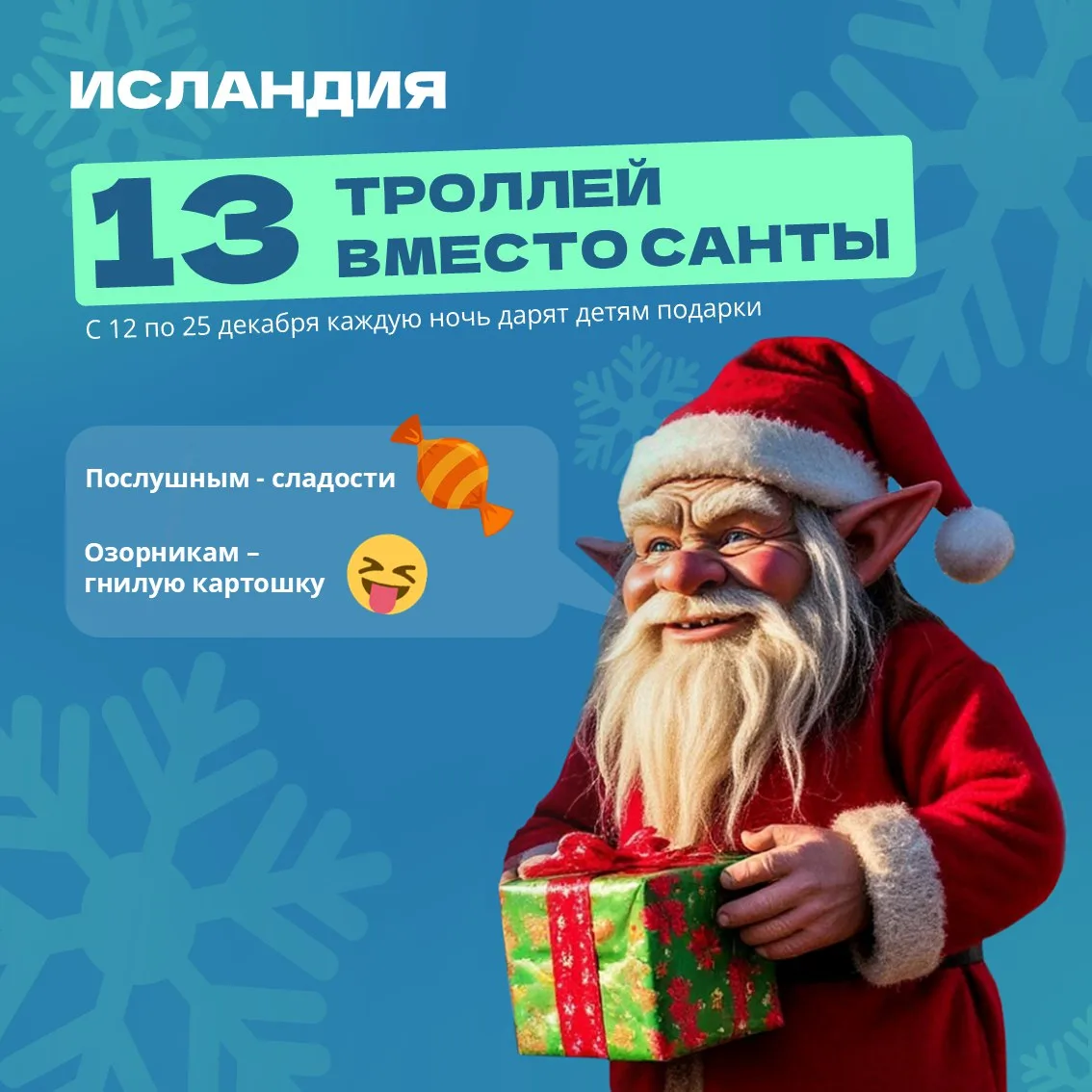 В Исландии за 13 дней до Рождества детей начинают навещать 13 озорных святочных троллей. Они приходят по одному каждую ночь и дарят подарки – сладкие и не очень.