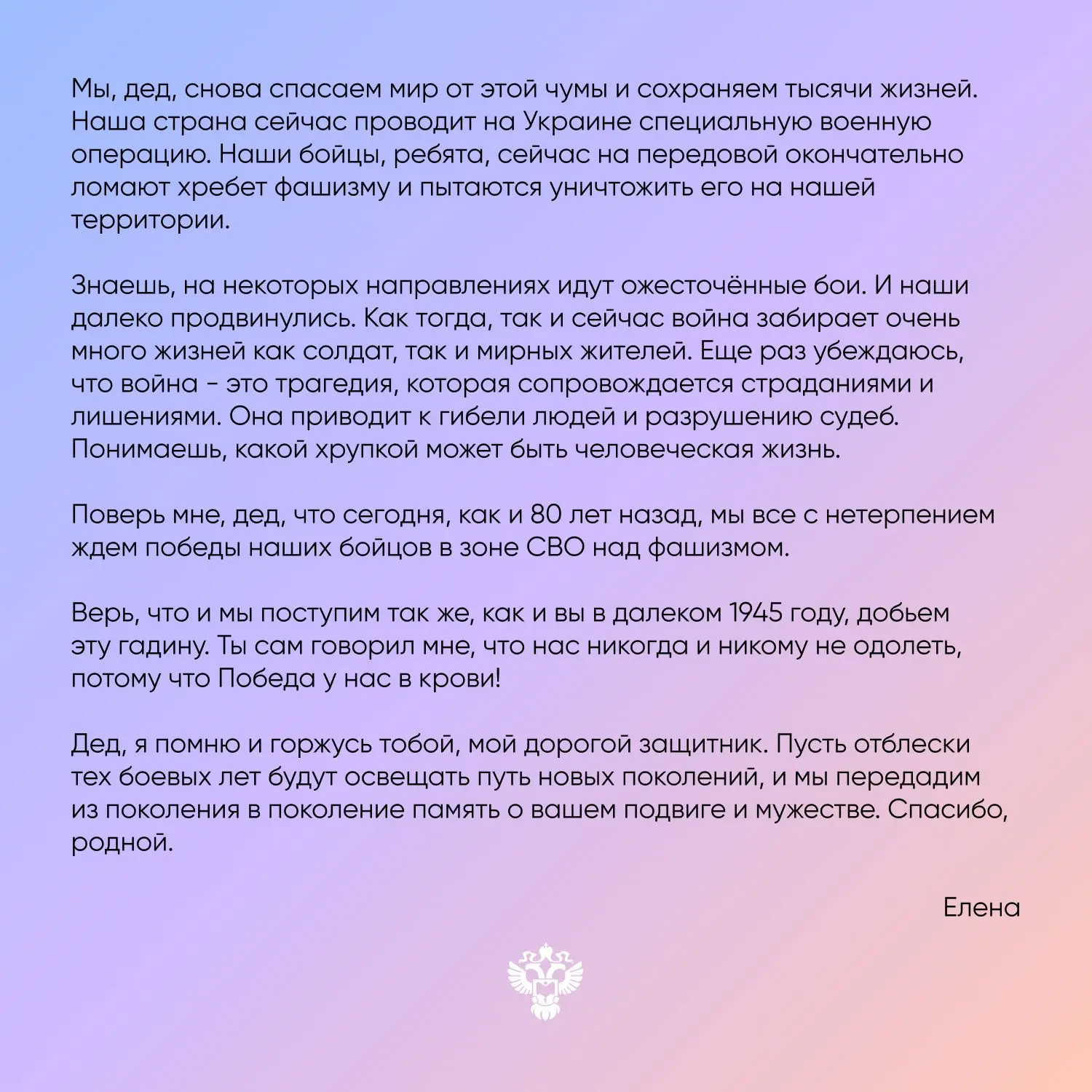 Мы приглашаем вас принять участие в конкурсе «Письмо победителю». Поблагодарите героя Великой Отечественной войны — летчика, медсестру или труженика тыла. Пусть ваше письмо станет мостом между эпохами!