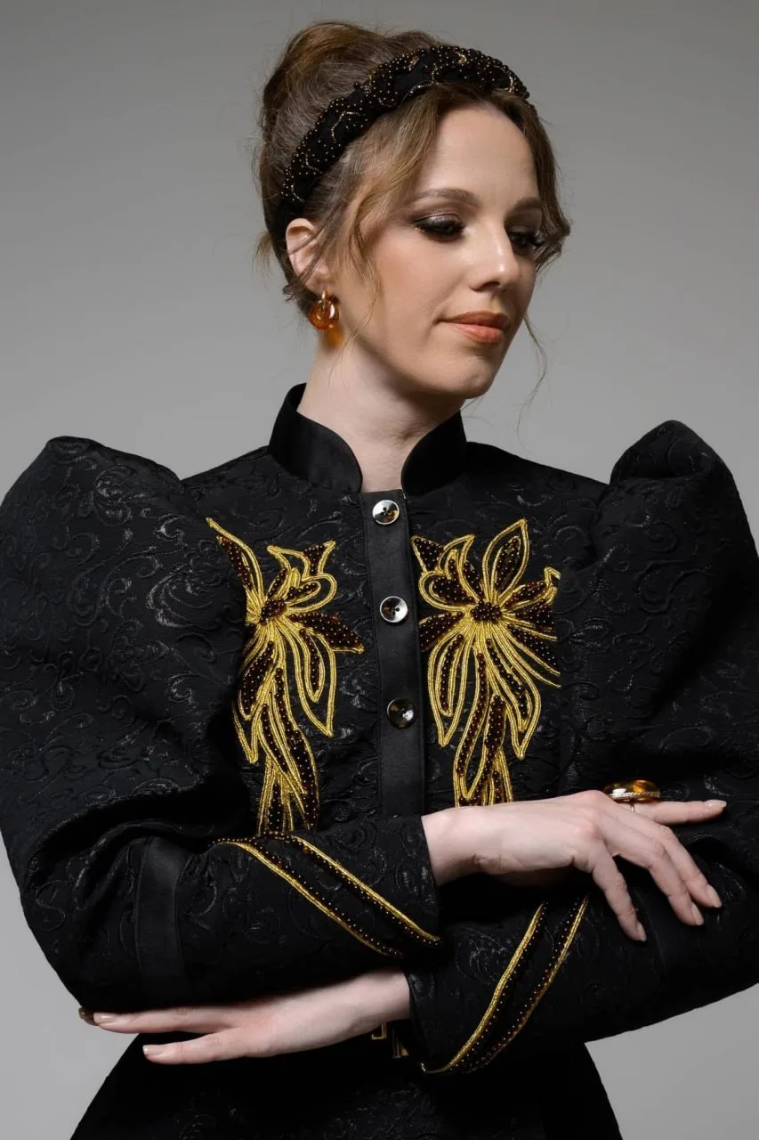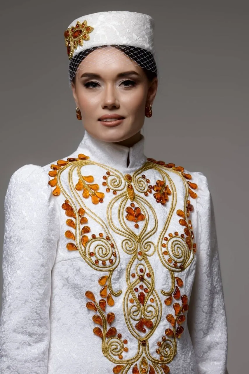 Для создания образцов мастера предприятия использовали около трех килограммов солнечного камня. Янтарь стал ключевым акцентом – его можно увидеть на воротниках, манжетах, лацканах пиджаков, поясах и головных уборах.