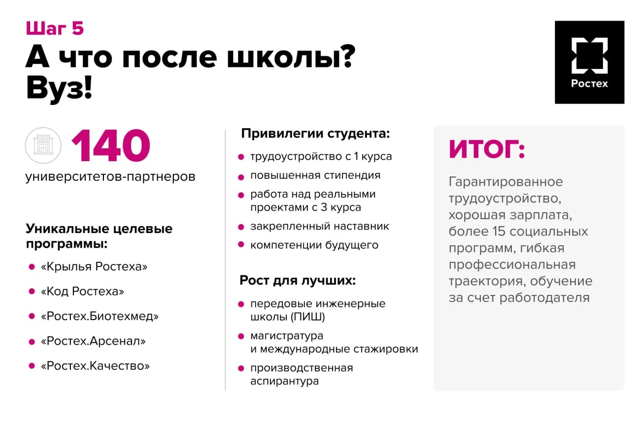 Первая ступень программы предусматривает подготовку будущих специалистов еще со школы. Ученики «Биотех-классов» углубленно изучают естественно-научные дисциплины и проходят практическую подготовку в специально оборудованных школьных лабораториях. Далее обучение продолжается в вузах-партнерах. Выпускники «Ростех.Биотехмед» получают серьезное преимущество перед сверстниками из традиционных программ: их практический опыт на 2–3 года опережает стандартный уровень подготовки. Это позволяет им претендовать на более высокие позиции при трудоустройстве и выстраивать ускоренную карьерную траекторию с соответствующим уровнем дохода.
