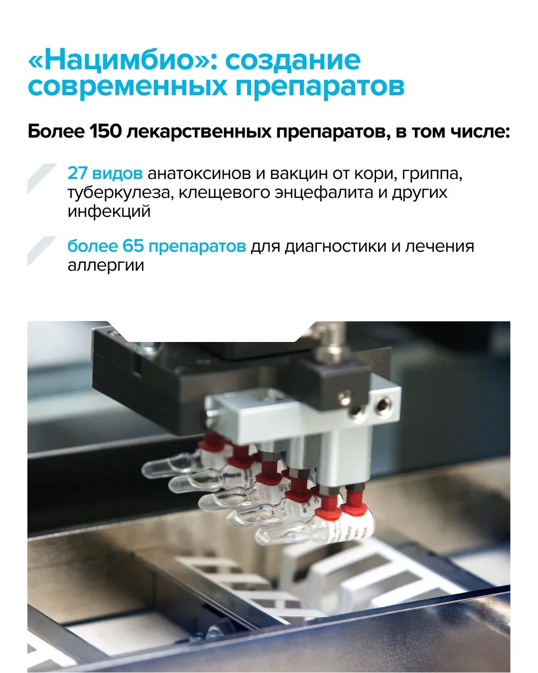 ▪️ «Нацимбио» – разрабатывает и производит вакцины и анатоксины, препараты крови, аллергены и другие препараты. Единственная компания, которая выпускает лекарственные бактериофаги в нашей стране и ряде государств СНГ. Предприятия холдинга работают по полному циклу – от научных разработок и производства сырья до серийного выпуска и поставок препаратов в рамках Национального календаря профилактических прививок (НКПП).