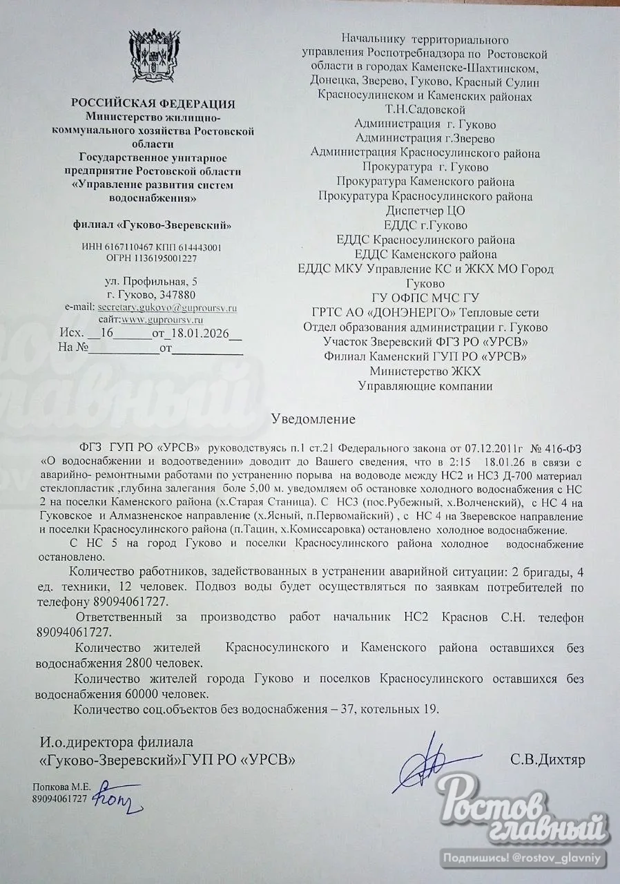 🚱 Повторный порыв на магистральном водоводе оставил без воды жителей Гукова, Зверева и прилегающих поселков в Красносулинском и Каменском районах!