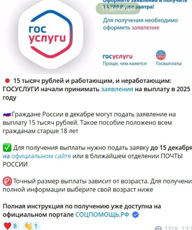 Аферисты отправляют SMS и сообщения в мессенджерах с обещаниями «декабрьских выплат» в 15 тысяч рублей якобы от портала Госуслуг. Получатели получают ссылки с призывом «успеть до 15 декабря», ведущие на скамерские сайты, где их заманивают в нелегальные казино, фейковые инвестиции или заставляют скачать вредоносное ПО.