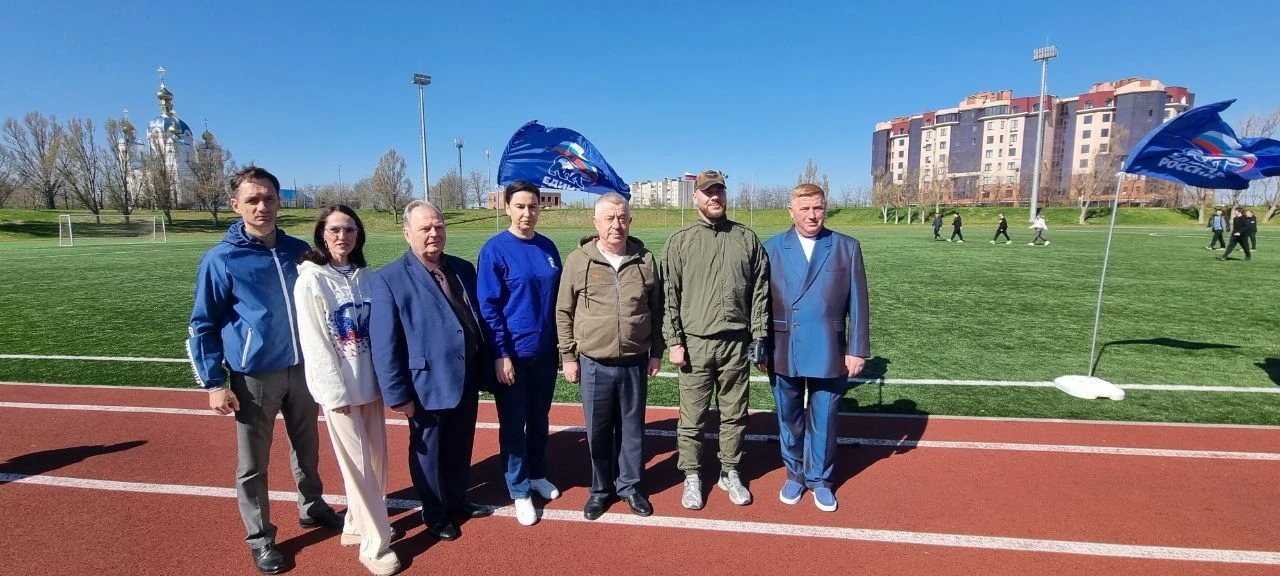 На стадионе Луганского государственного университете им. В. Даля присутствовали Первый заместитель Секретаря ЛРО ВПП «Единая Россия», депутат Народного Совета ЛНР Леонов В.В., глава города Луганска Пащенко Я.В., ректор университета им. В. Даля Рябичев В.Д.