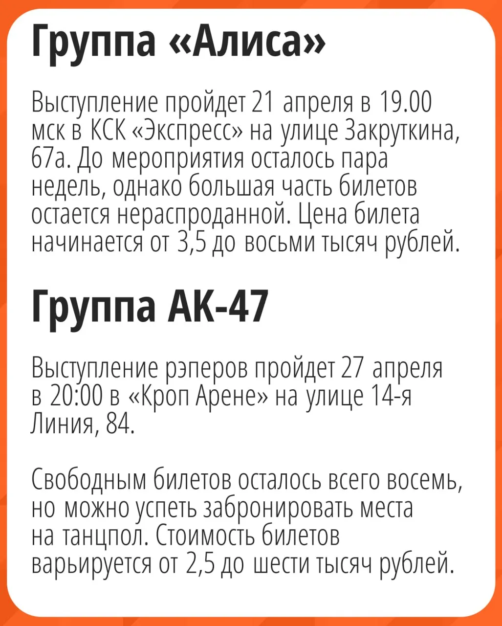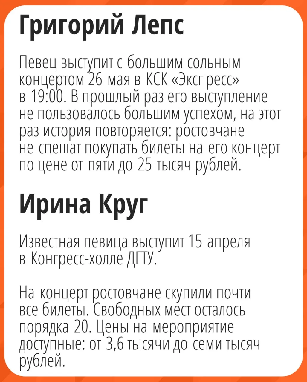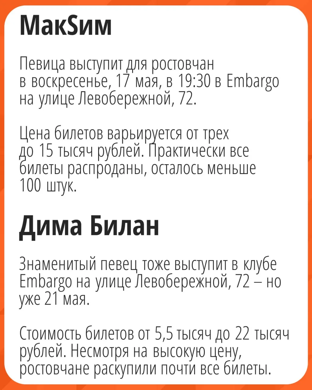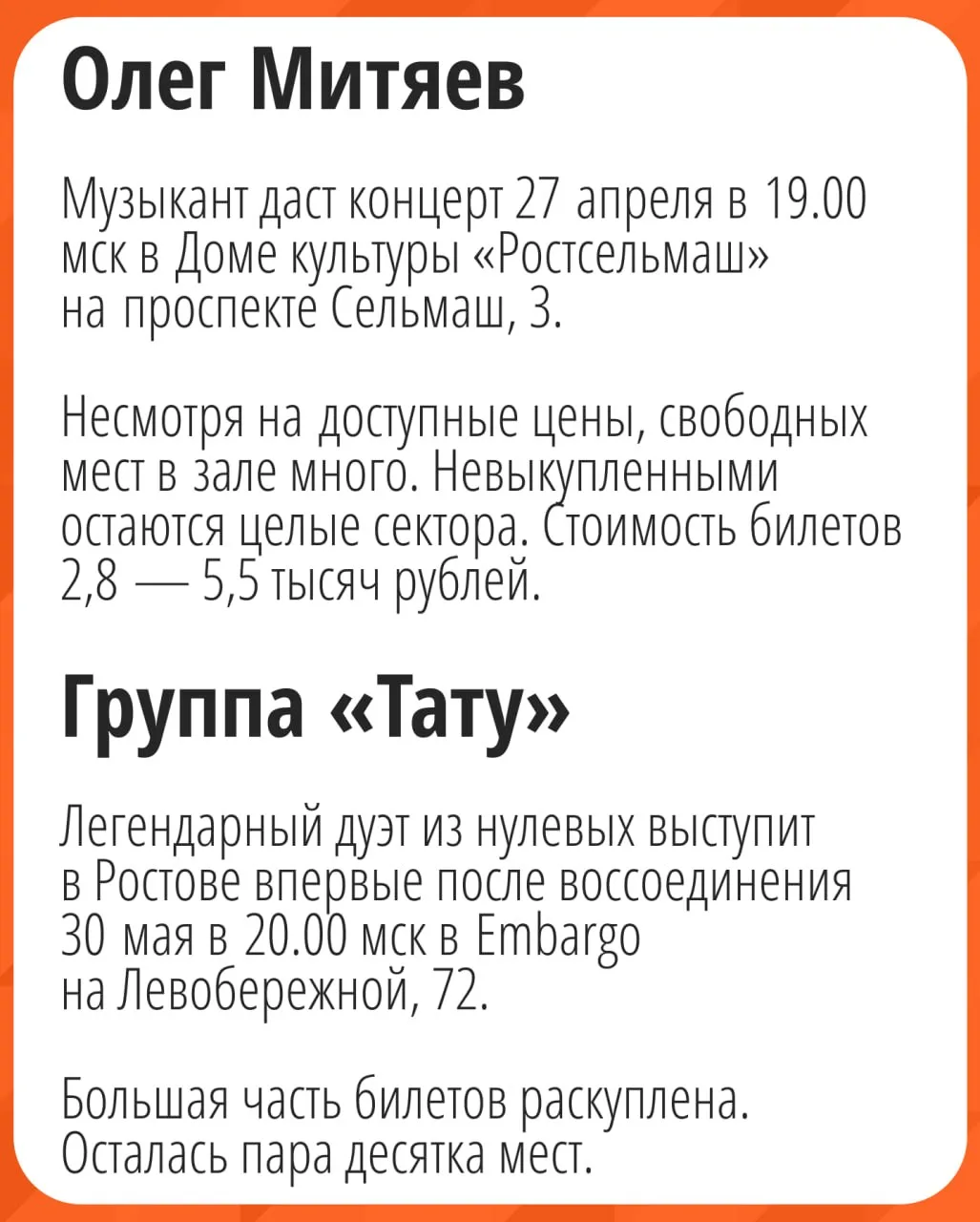Рассказываем, кто выступит в Ростове — чтобы вы точно ничего не пропустили. Заодно мы подсчитали, как у артистов идёт продажа билетов. Все детали — в наших карточках.
