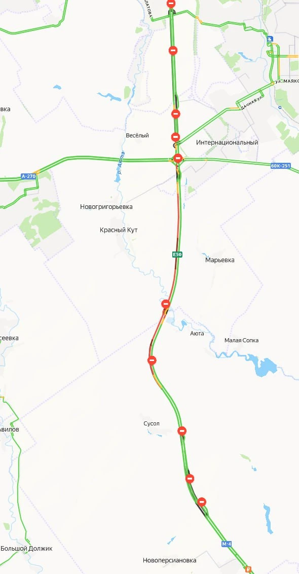 Судя по картам, начинается эта пробка от пересечения с трассой А-270 и заканчивается недалеко от хутора Сусол в Октябрьском районе. Примерное время, за которое можно преодолеть эту пробку — полтора часа.