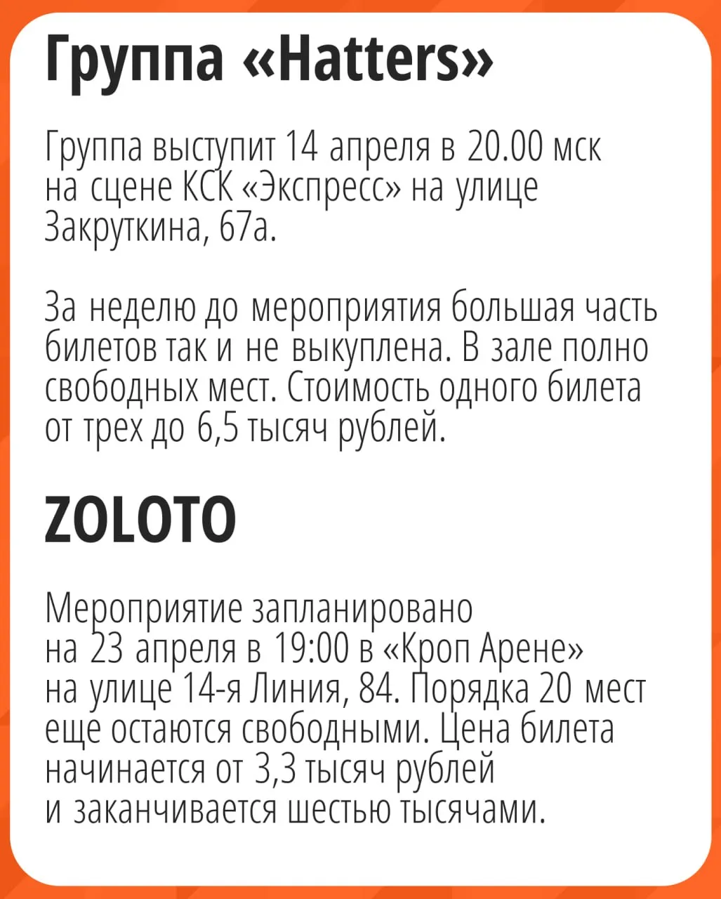 Организаторы сообщают, что шанс попасть на концерт есть, только если кто-то из зрителей по личным причинам решит оформить возврат — тогда места снова появятся в продаже.