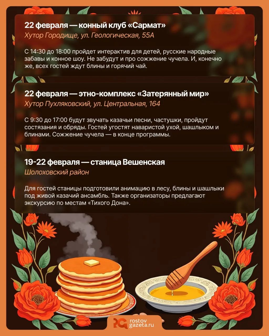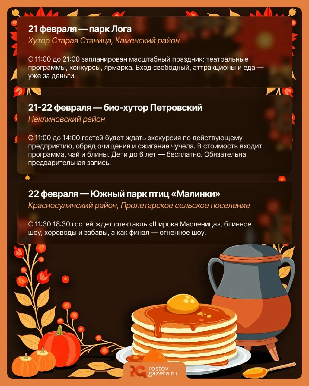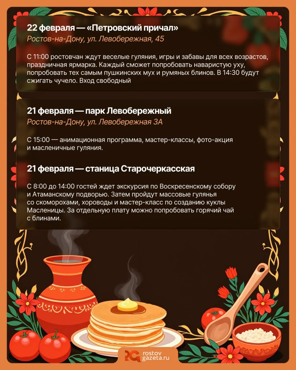 🥞 Масленица в разгаре, друзья! На этих выходных по всей области (и в Ростове, само собой) пройдут масштабные народные гуляния на праздник. Будут блины, анимация, сожжения чучел зимы и ещё много интересного — в каждом месте предлагается что-то своё.