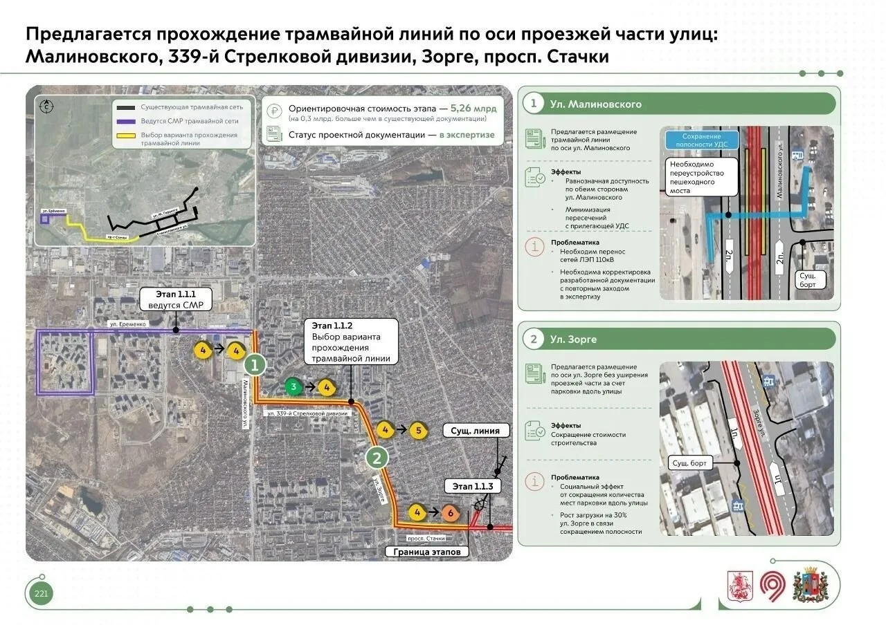 Вот только все эти выгодные условия, по мнению Зайцева, наткнулись на позицию департамента автодорог, которая блогеру кажется непонятной. По словам урбаниста, департамент требует сохранить количество полос для автомобилей при строительстве трамвая — но за расширение улиц 339 Стрелковой Дивизии, Зорге и проспекта Стачки (от Зорге до Мичуринской) платить не хочет.