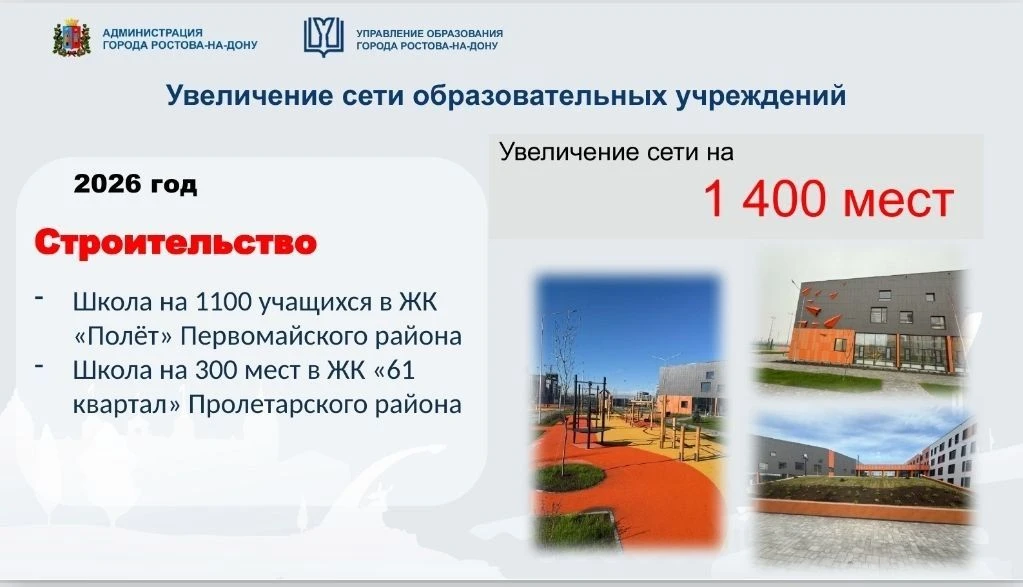 🔸 Прежде всего, в 2026 году появятся две новые школы: на 1100 мест на месте старого аэропорта и на 300 мест в Пролетарском районе. Капитально отремонтируют школы №21, 23, 14, 36.