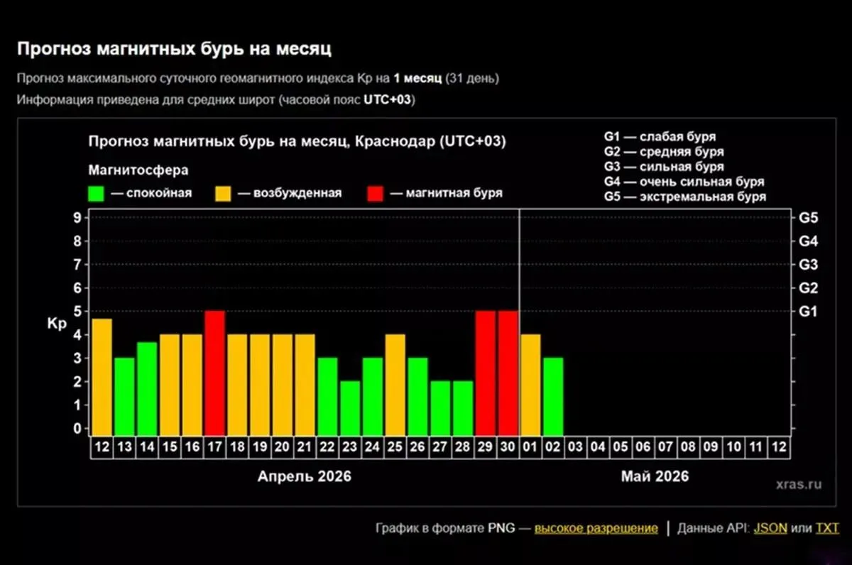 По данным Лаборатории солнечной астрономии, высокая вероятность бурь — 17, 29 и 30 апреля. Повышенный геомагнитный фон ожидается с 15 по 21 и 25 апреля.