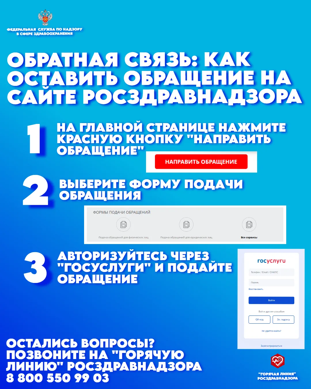 Оставить сообщения можно по бесплатному телефону «Горячей линии» 8-800-550-99-03 или по телефонам горячих линий в регионах https://roszdravnadzor.gov.ru/pages/main/call/to/tel