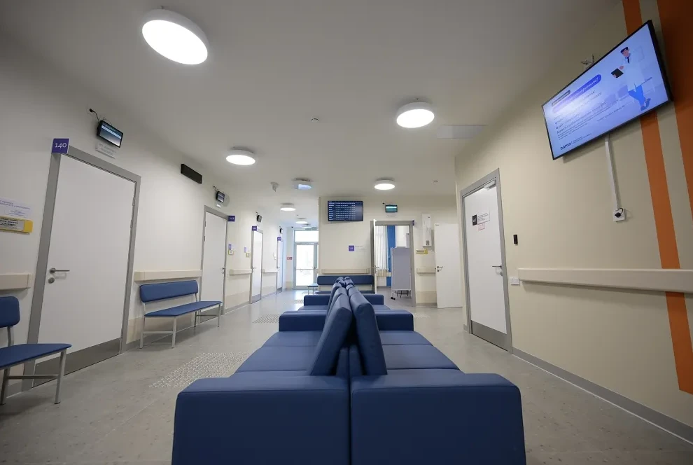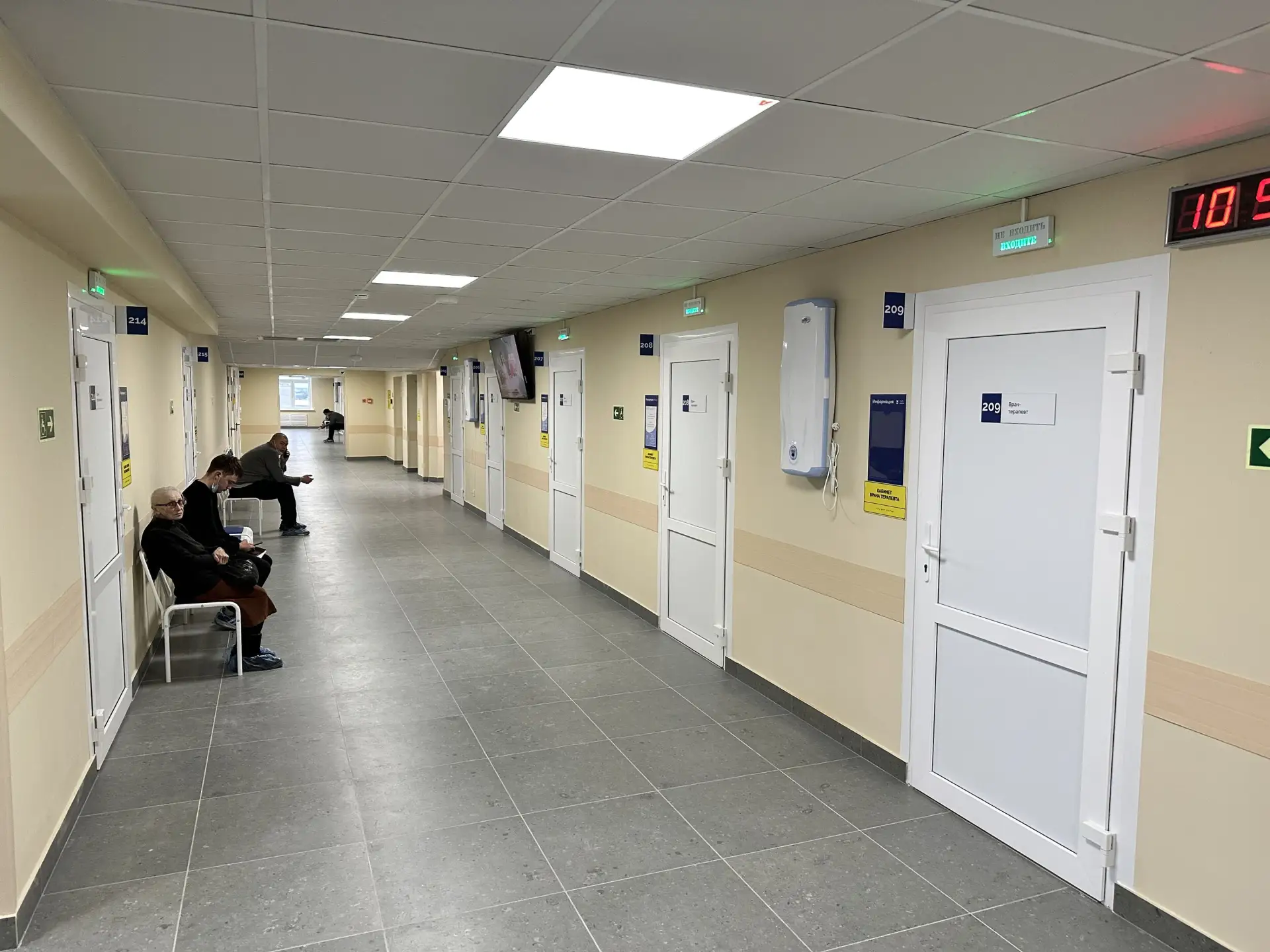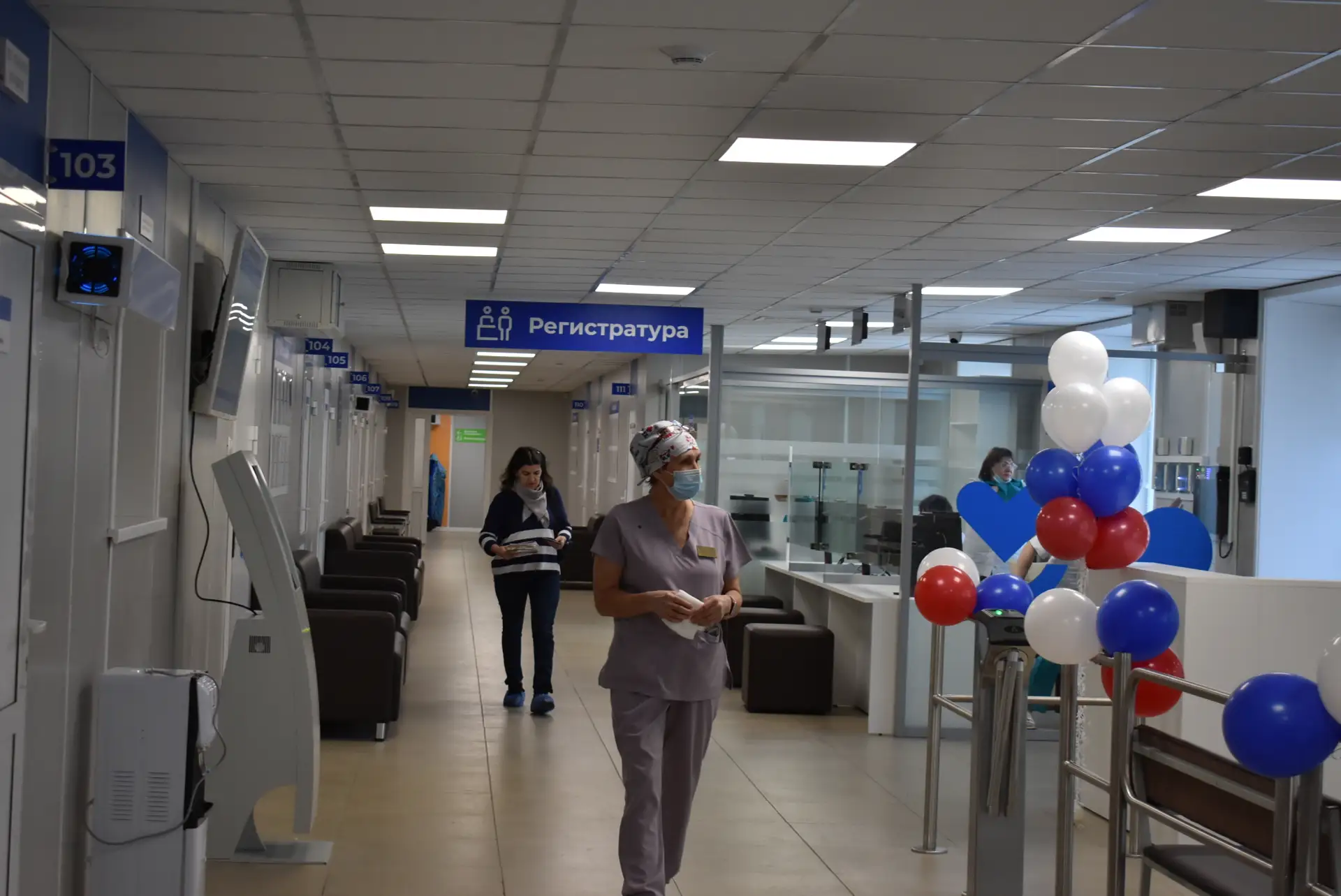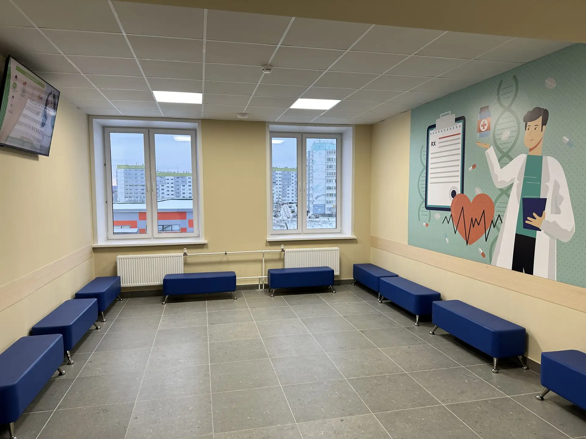 Ремонт поликлиники выполнен по принципу «бережливого» производства – организованы просторные светлые кабинеты, удобные зоны ожидания, продуманная навигация, регистратура «открытого типа», доступные условия для маломобильных граждан.