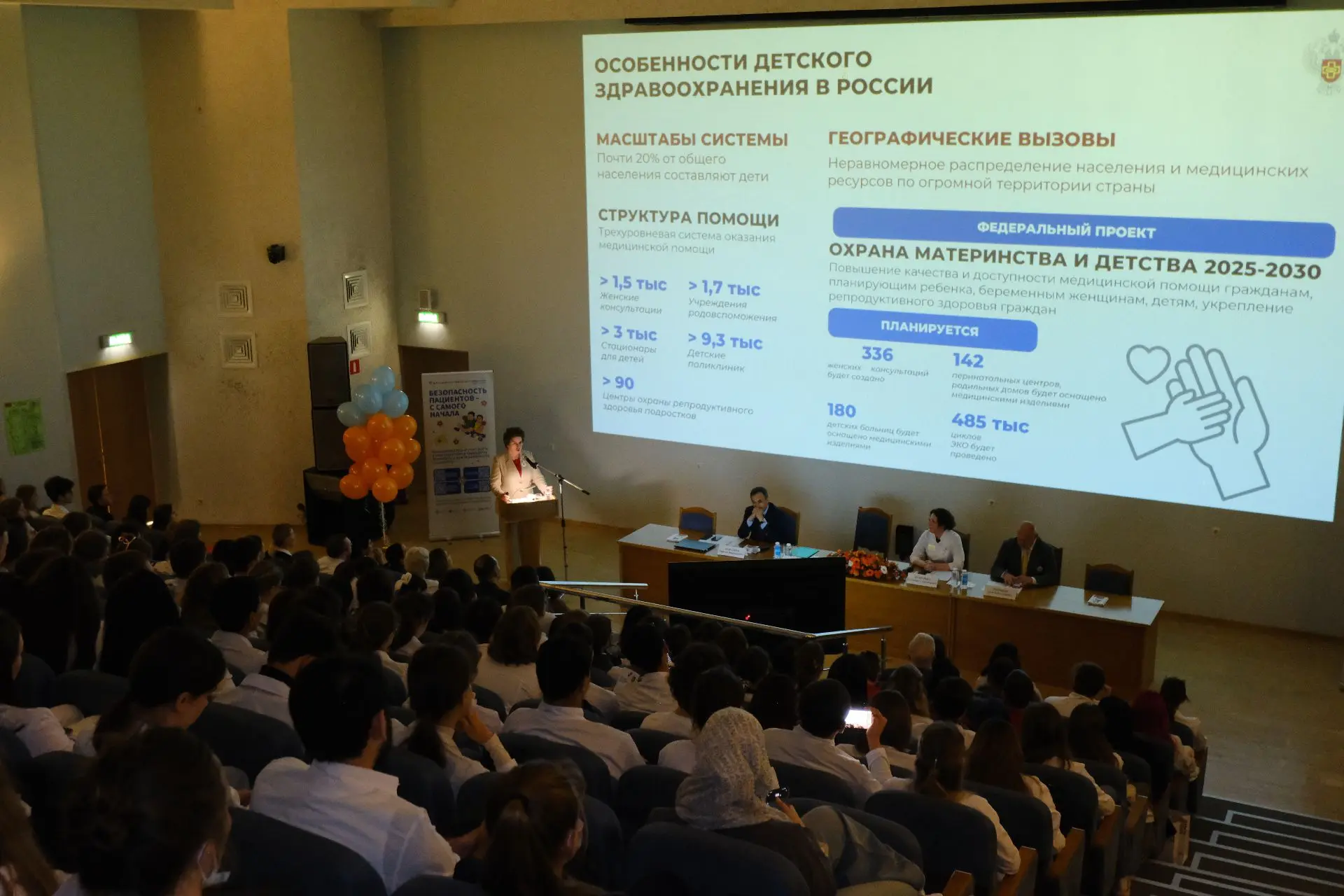 Послушать доклад руководителя Росздравнадзора Аллы Самойловой и директора Департамента медицинской помощи детям, службы родовспоможения и общественного здоровья Минздрава России Рафаэля Шавалиева собралось около 300 студентов и сотрудников ФГАОУ ВО РНИМУ им. Н.И. Пирогова, а также представители Всероссийского общественного движения «Волонтеры-медики».