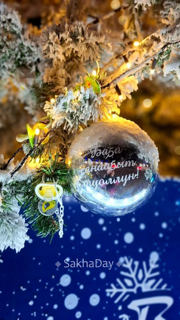 Сегодня гуляли и увидели на ёлке на площади Республики такую трогательную картину. На ёлке висят большие шары с написанными на них разными пожеланиями. Около одного шара с надписью "Ба5а санаа5ыт туоллун!" висят детские пустышки, аж три штуки...