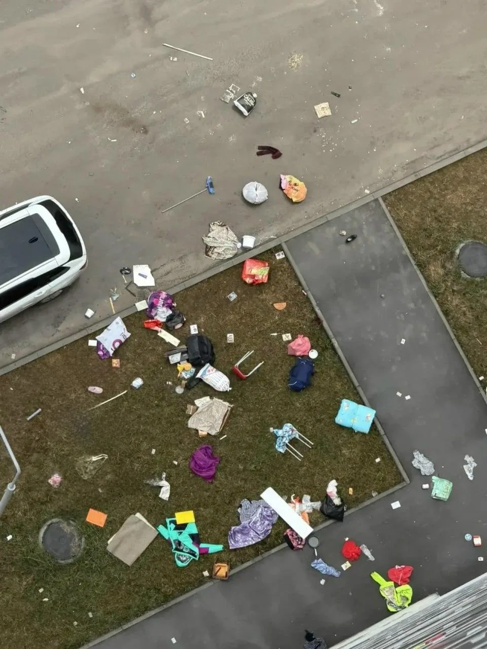 Второй день с 8 этажа на улицу летят вещи. Вчера кидали ножи, вилки, тарелки. Сегодня уже стулья, сковородки, одежда.