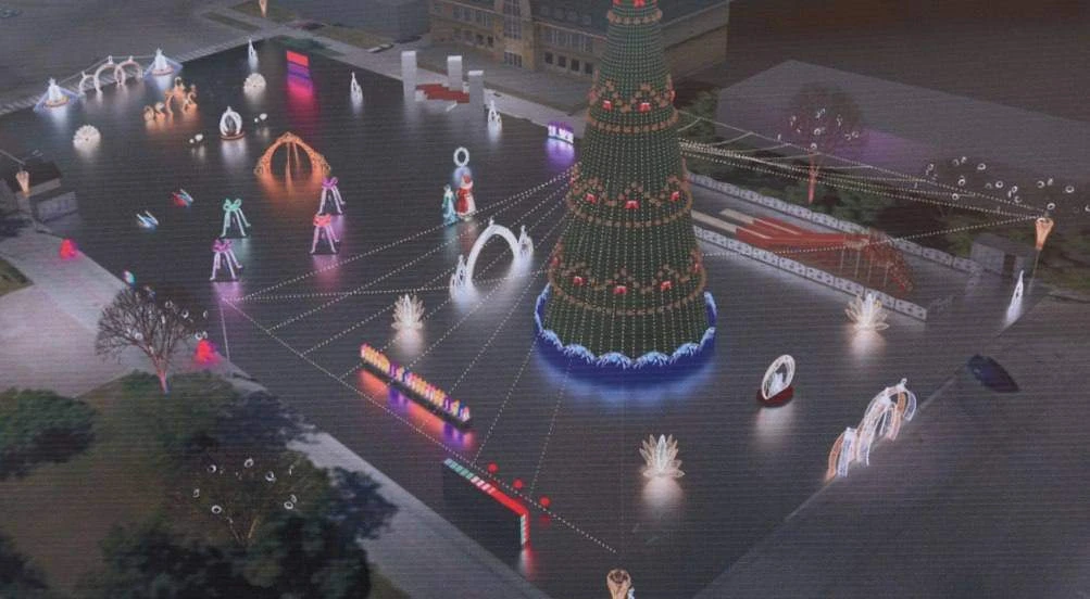 На площади Свободы установят около 30 светящихся объектов, фигуры Деда Мороза и Снегурочки, а также большую горку с двумя скатами.
