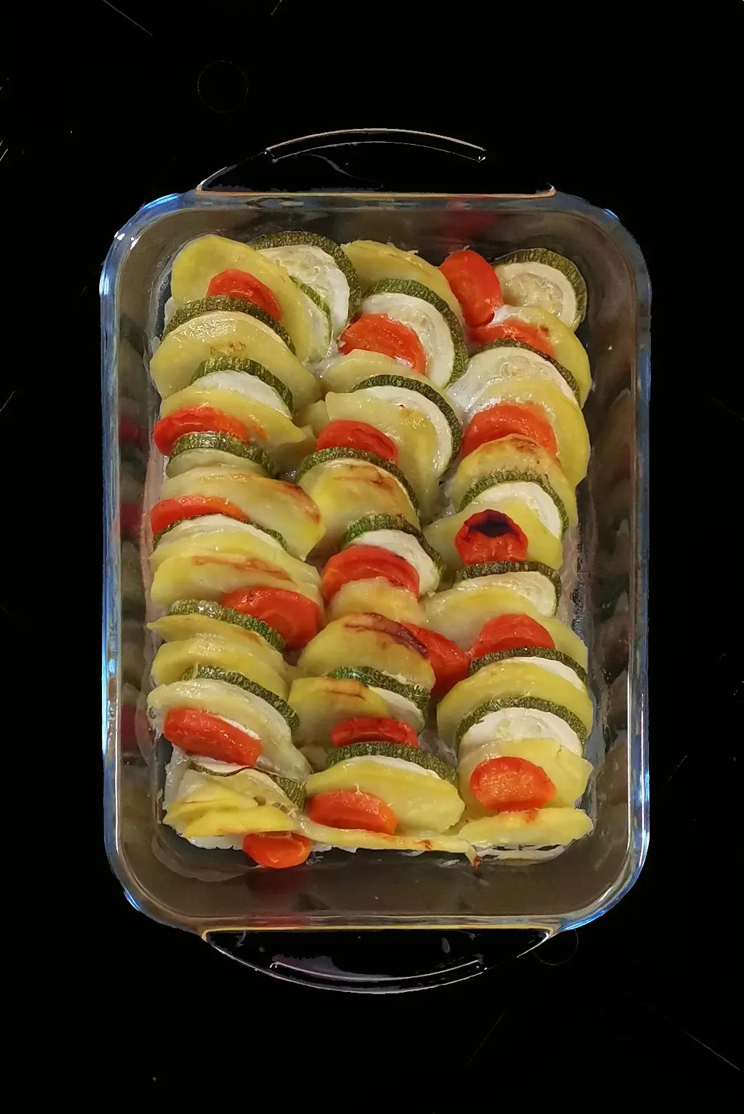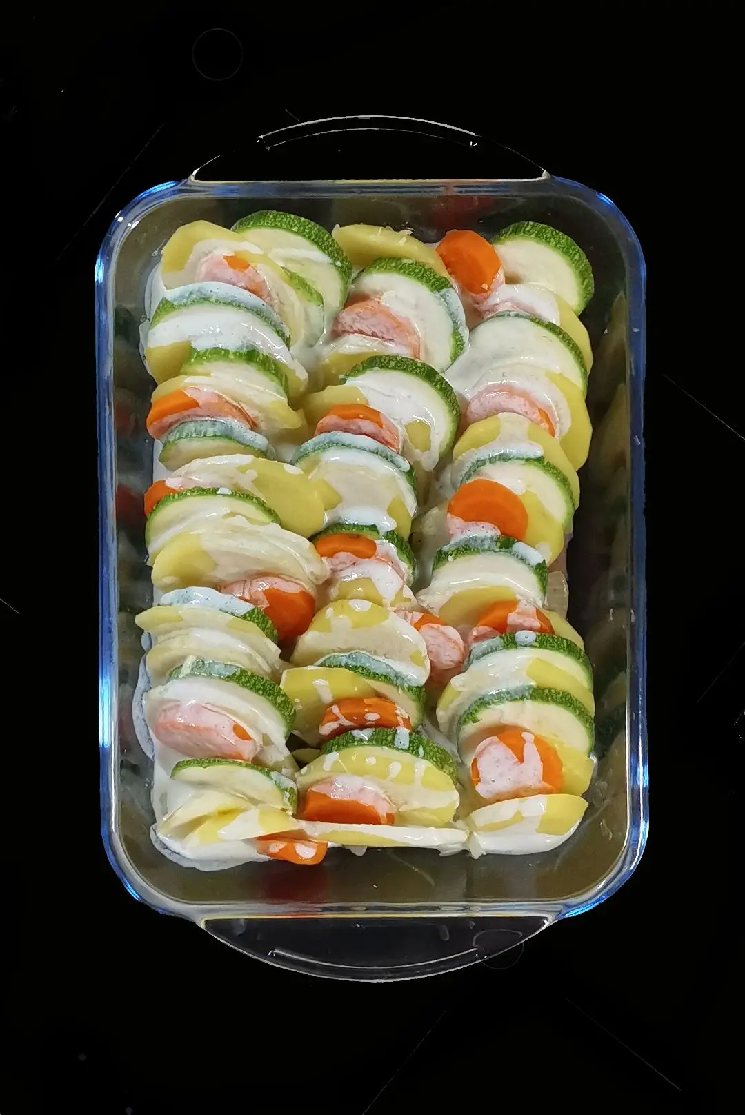 2. Сверху укладываем овощи. Тут цукини, морковь, картошка. Картошку и морковь предварительно припускаем в кипящей воде минуты 2-3 до полуготовности (варим уже нарезанными).