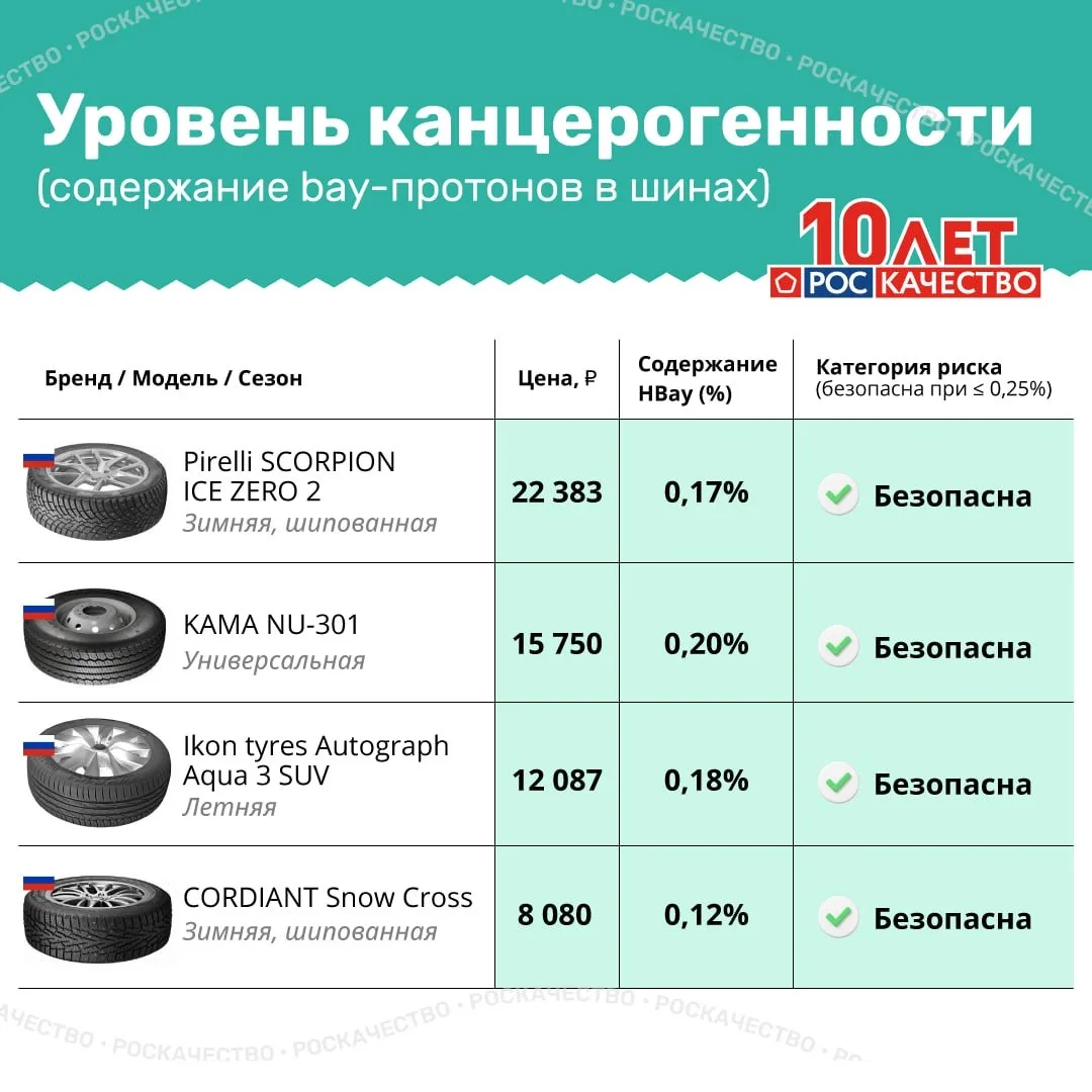 Мы проверили шины на содержание bay-протонов — опасных полициклических ароматических углеводородов, связанных с канцерогенными маслами. В карточках — наглядная инфографика по ценам, брендам и результатам испытаний.