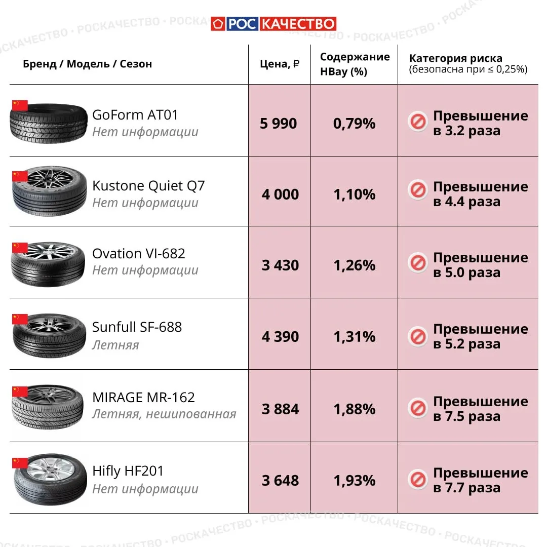 ❌Все исследованные китайские шины (6 моделей) показали значительные превышения нормы — от 3,2 до 7,7 раза.
