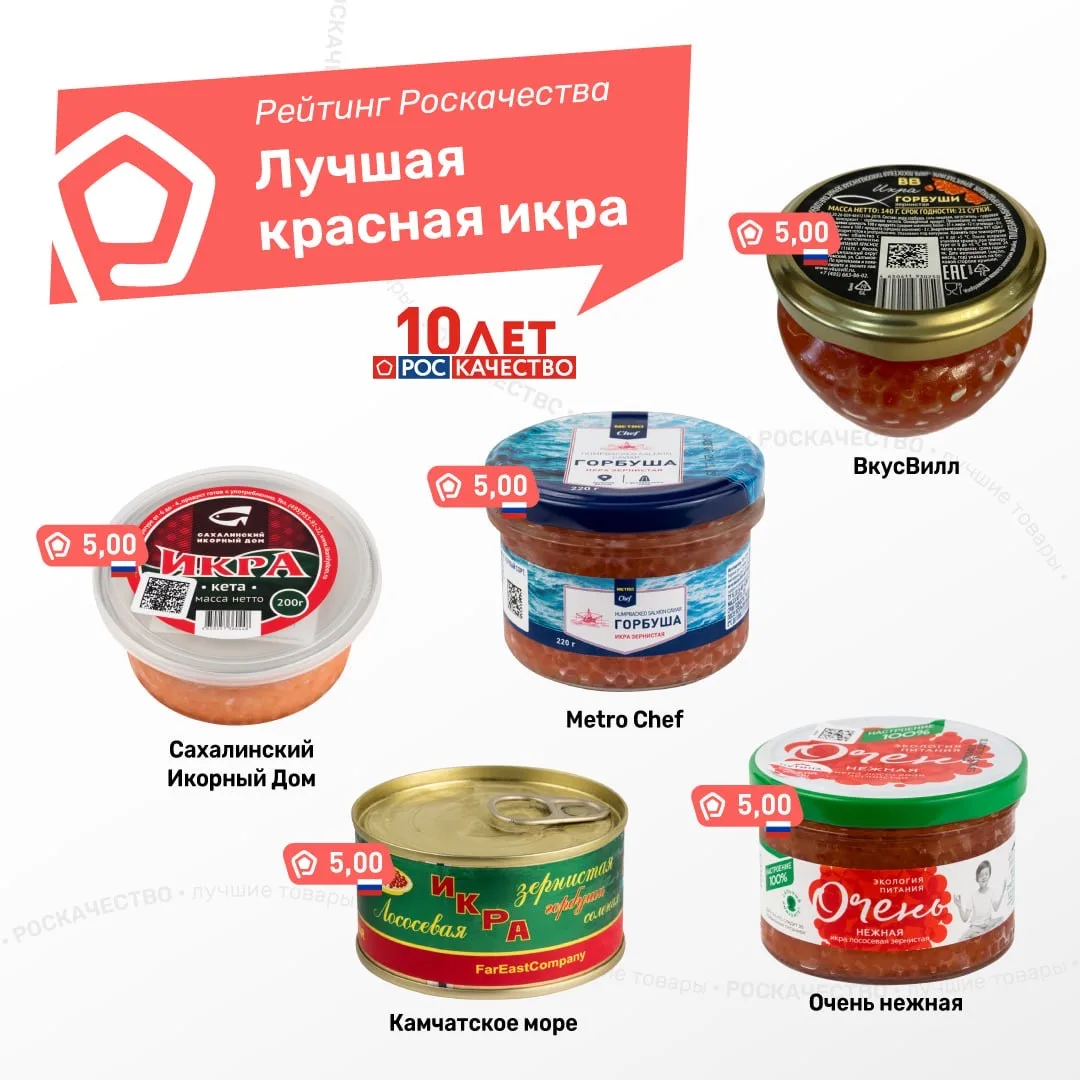 😊 Пять продуктов соответствуют как обязательным требованиям, так и опережающим требованиям стандарта Российской системы качества: «Очень нежная», «Камчатское море», «ВкусВилл», «Сахалинский икорный дом», Metro Chef. Эти товары могут претендовать на получение российского Знака качества.