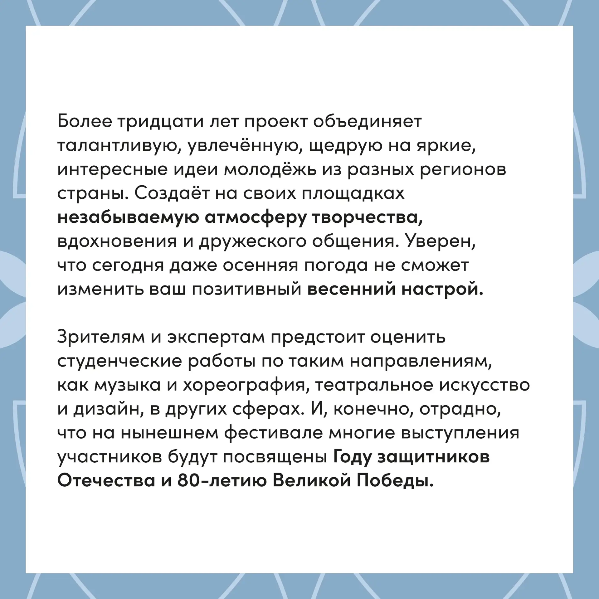 «Зрителям и экспертам предстоит оценить студенческие работы по таким направлениям, как музыка и хореография, театральное искусство и дизайн, в других сферах. И, конечно, отрадно, что на нынешнем фестивале многие выступления участников будут посвящены Году защитников Отечества и 80-летию Великой Победы», — подчеркнул Президент России.