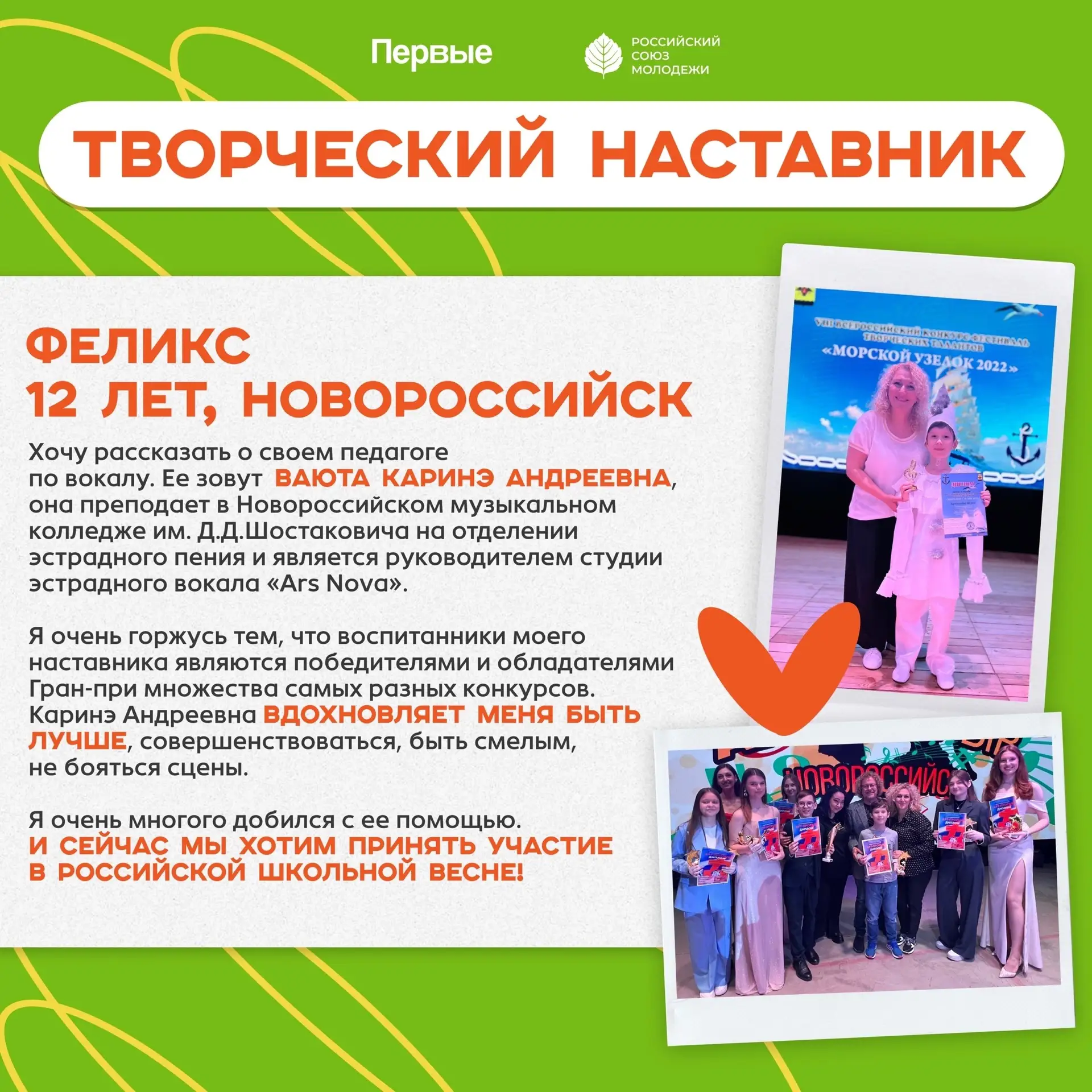 Он рассказывает о своем педагоге по вокалу Каринэ Андреевне, которая не только учит петь, но и помогает поверить в себя.