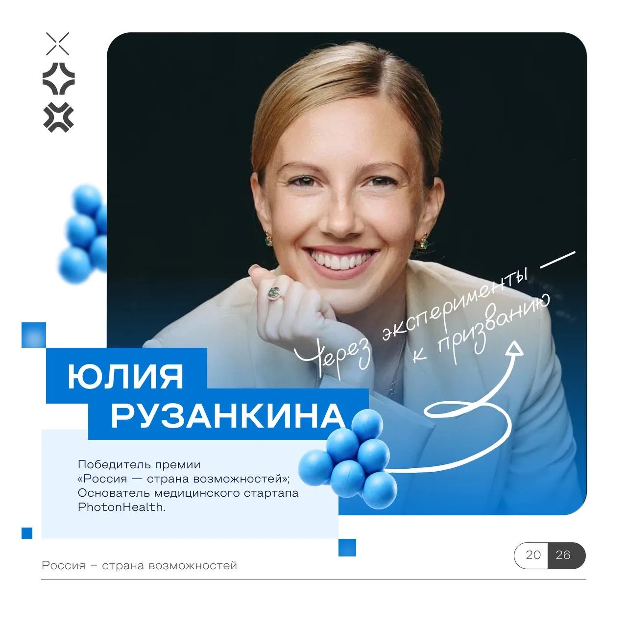 Победитель Премии «Россия — страна возможностей» и основатель медицинского стартапа PhotonHealth Юлия Рузанкина делится личной историей о том, как лабораторные исследования становятся открытиями и реальной помощью людям.
