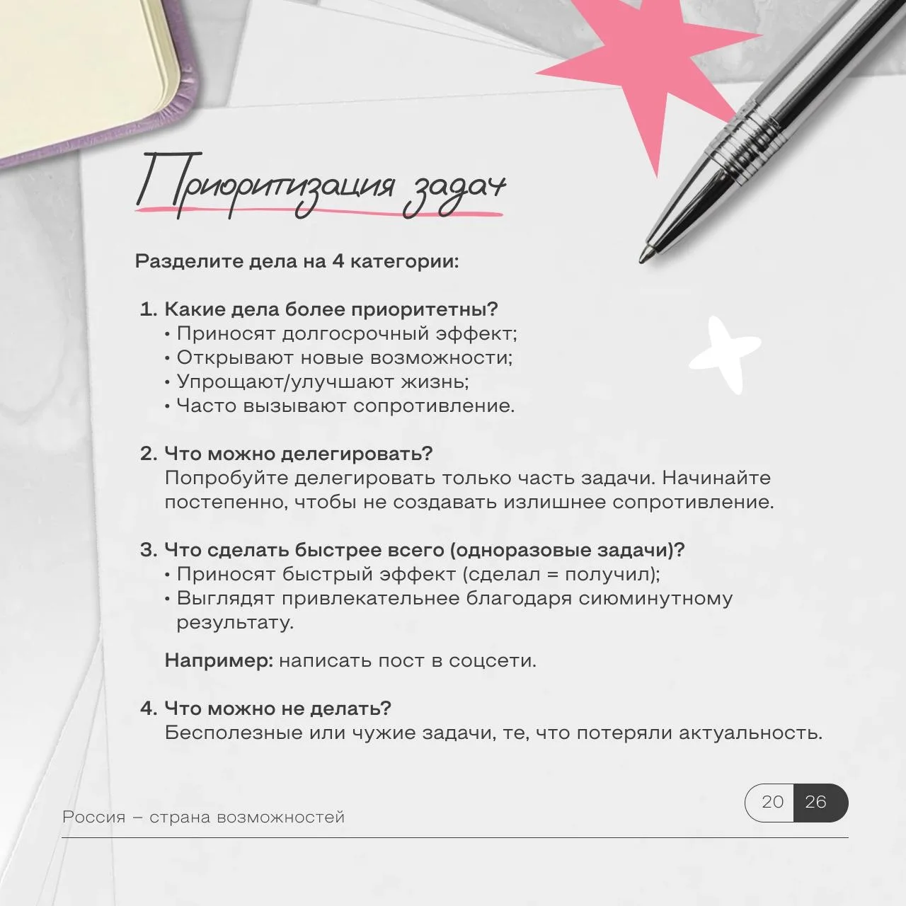 Быть продуктивным — это работать умнее. Вместе с проектом «Флагманы образования» собрали 5 простых приемов, которые помогают держать фокус, экономить силы и реально продвигаться по задачам — листайте карточки ✔️