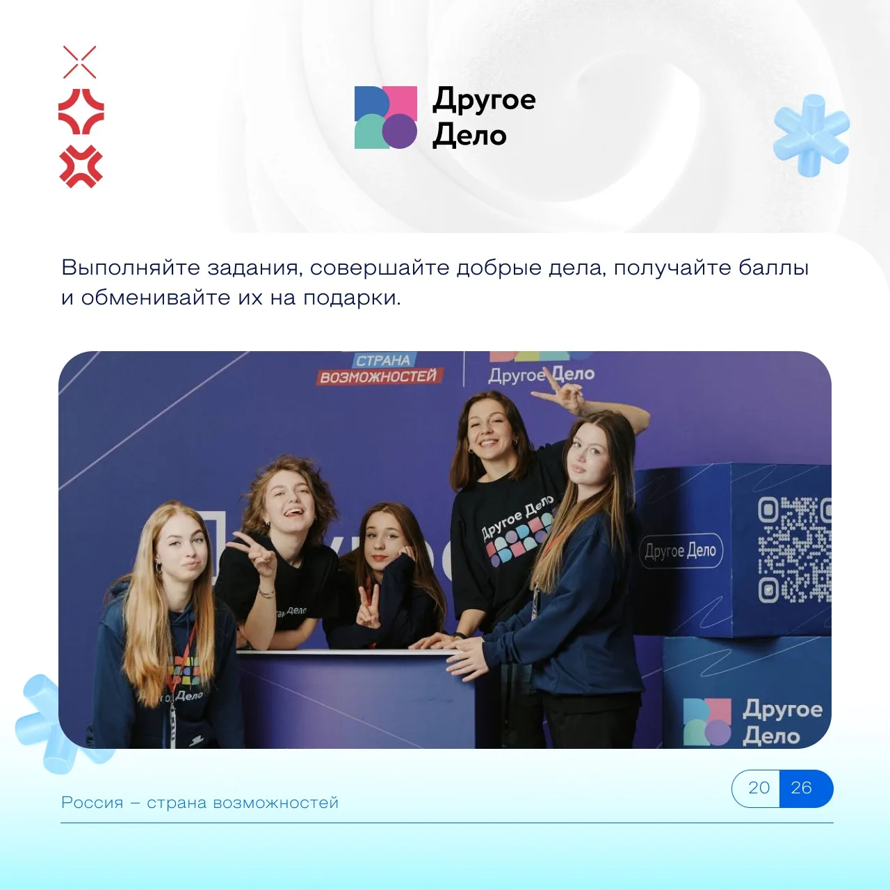 💠 Выполнить с 23 февраля в приложении «Хорошие новости» 3 тематических задания, в которых вы можете поздравить близких и знакомых с праздником и пройти тематические викторины. Выполнив их, вы получите баллы проекта, которые можно обменять на бонусы от партнеров.