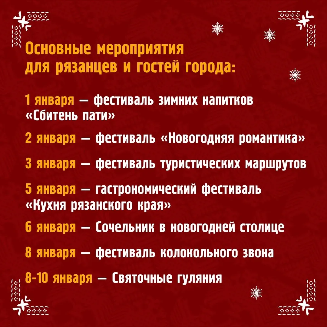 🔸Среди мероприятий: фестивали богатырской силы «Молодецким потехам мороз не помеха», зимних напитков «Сбитень пати», колокольного звона «Рязанские перезвоны. Зима» и другие.