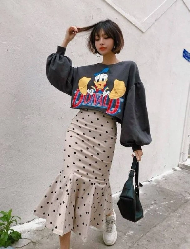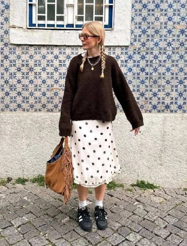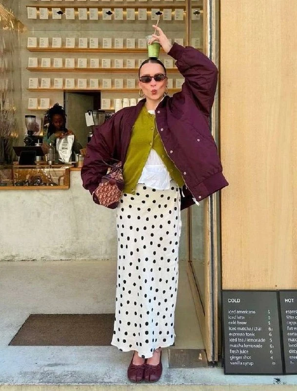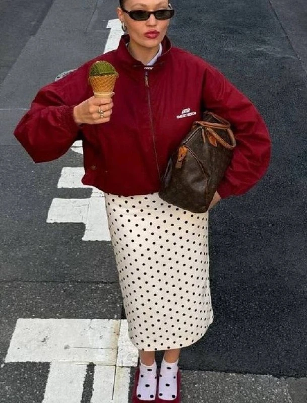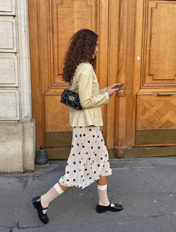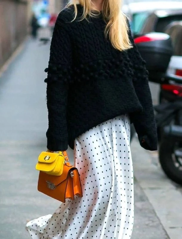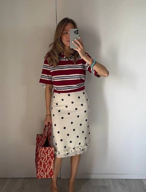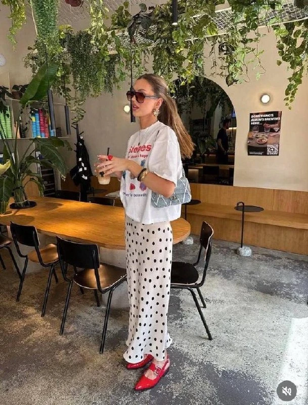 Белая юбка в горошек - вещь с характером, она может быть игривой, а может- статусной. Всё решает стилизация.