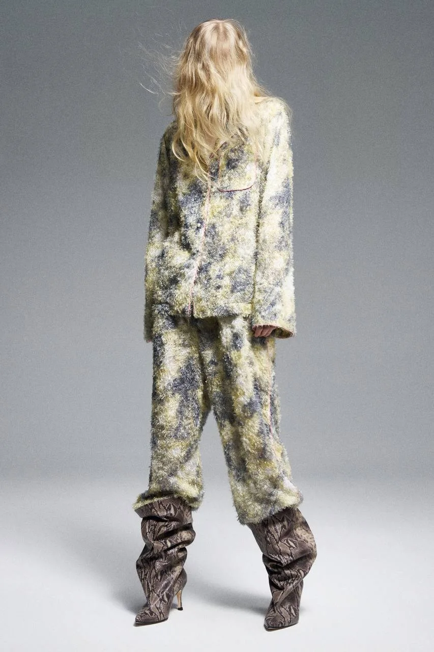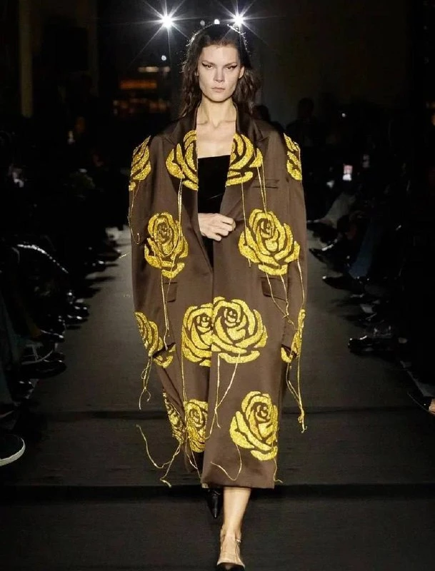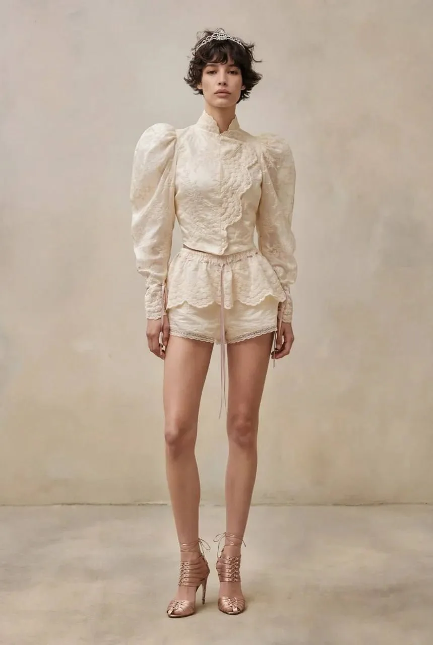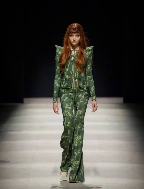 Основой коллекции стала эклектика. Нарочито феминные корсеты с вышивками гармонично сочетаются с брюками-шароварами с воланами, жаккардовые жакеты с пижамными сетами и воздушными юбками, а платья-бандо — с грубыми сапогами в стиле бохо.