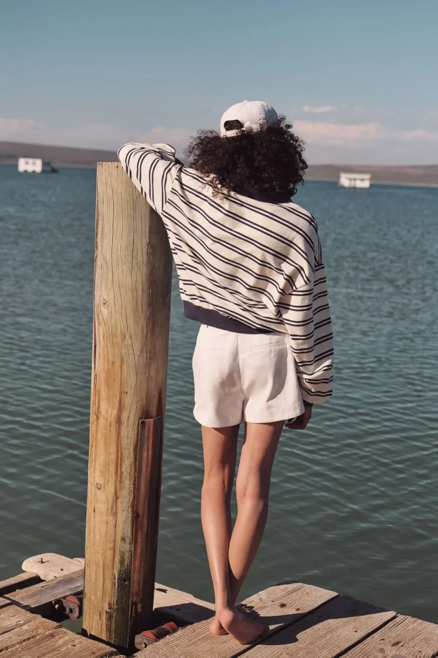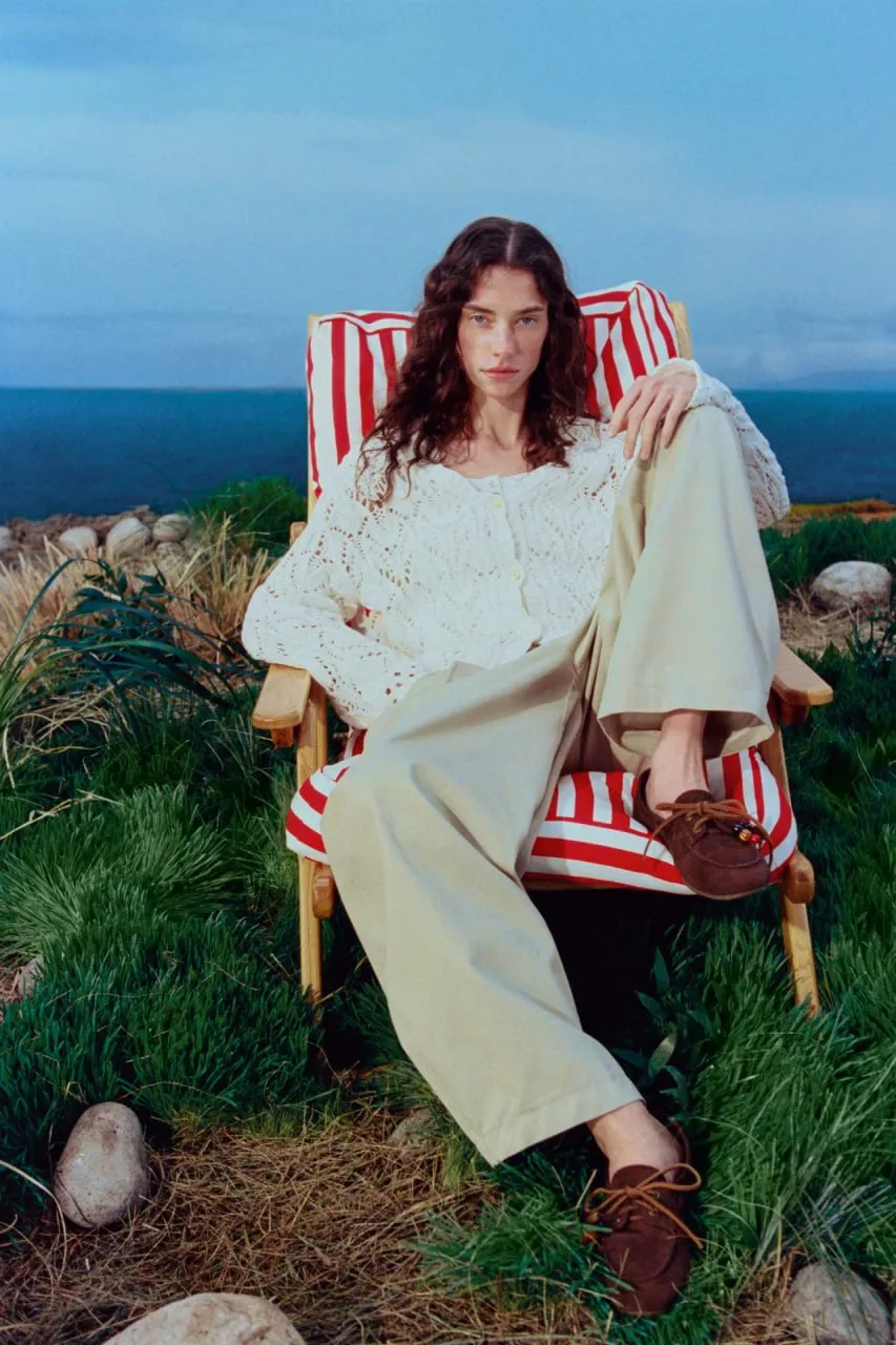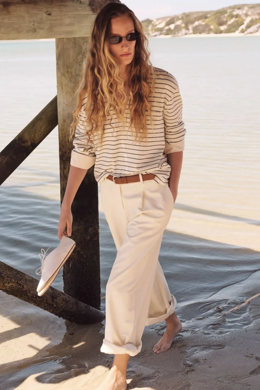 Отсылки к парусному спорту, полоска, натуральные ткани и много светлых оттенков. Всё как будто выгорело на палубе и пропиталось ветром.