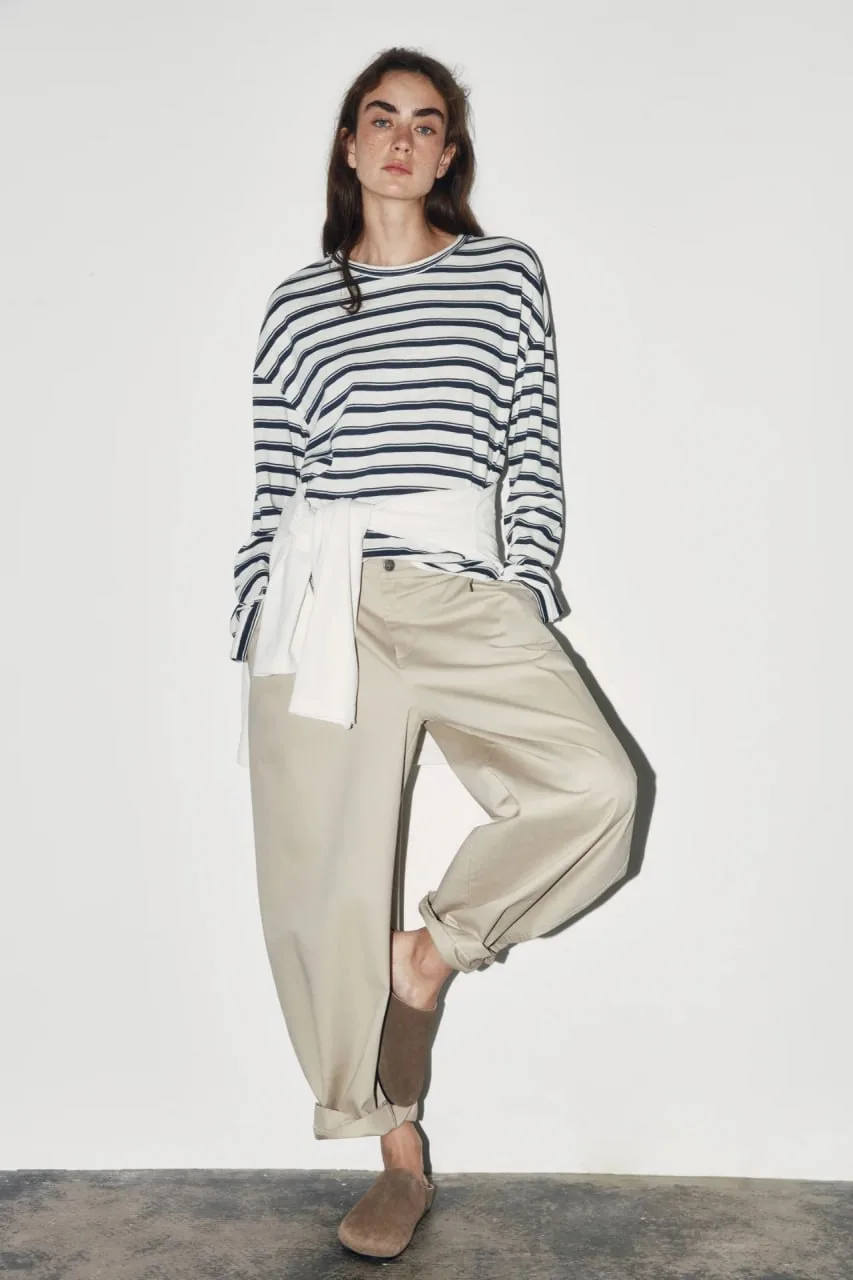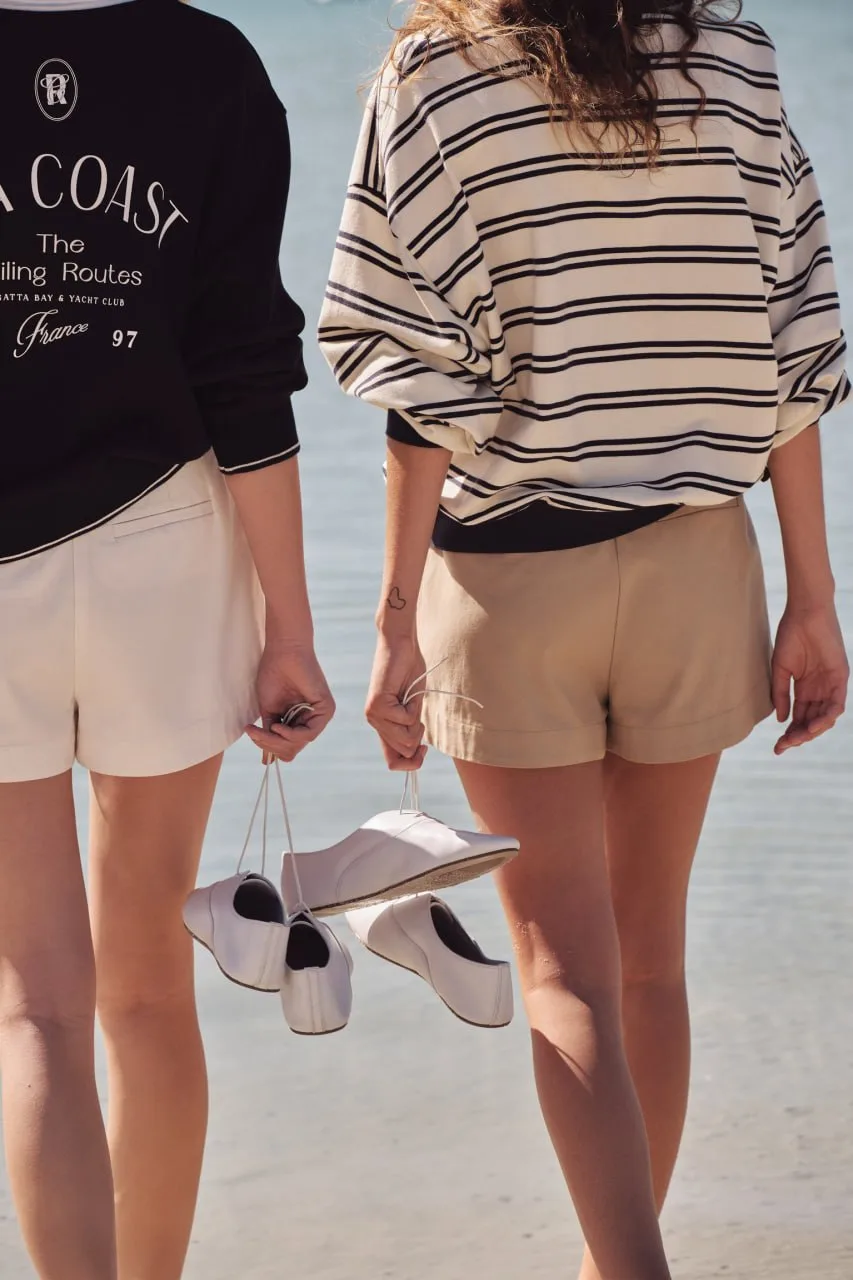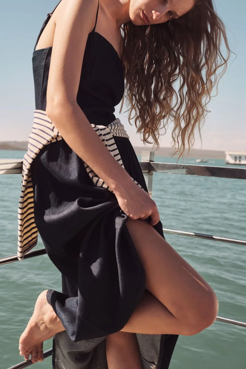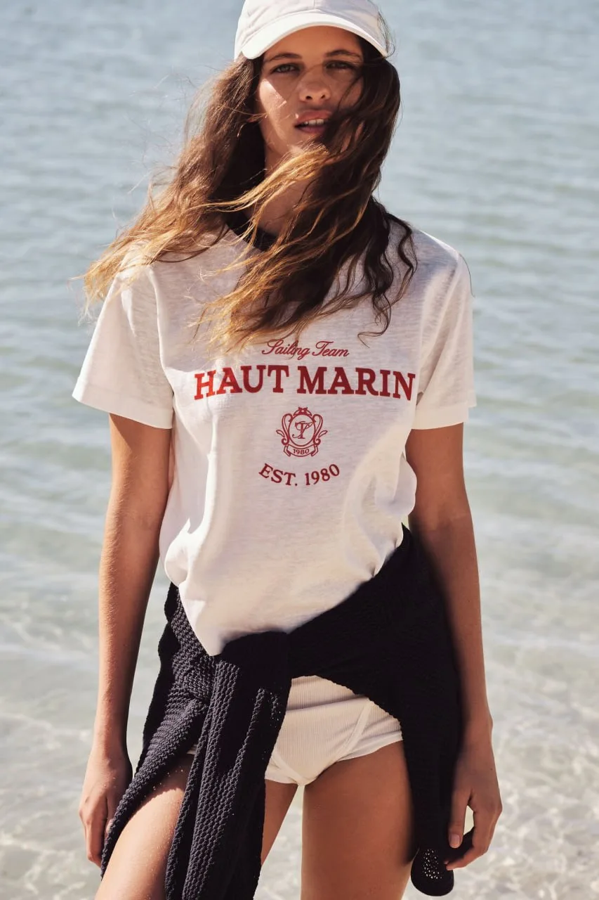 Отсылки к парусному спорту, полоска, натуральные ткани и много светлых оттенков. Всё как будто выгорело на палубе и пропиталось ветром.