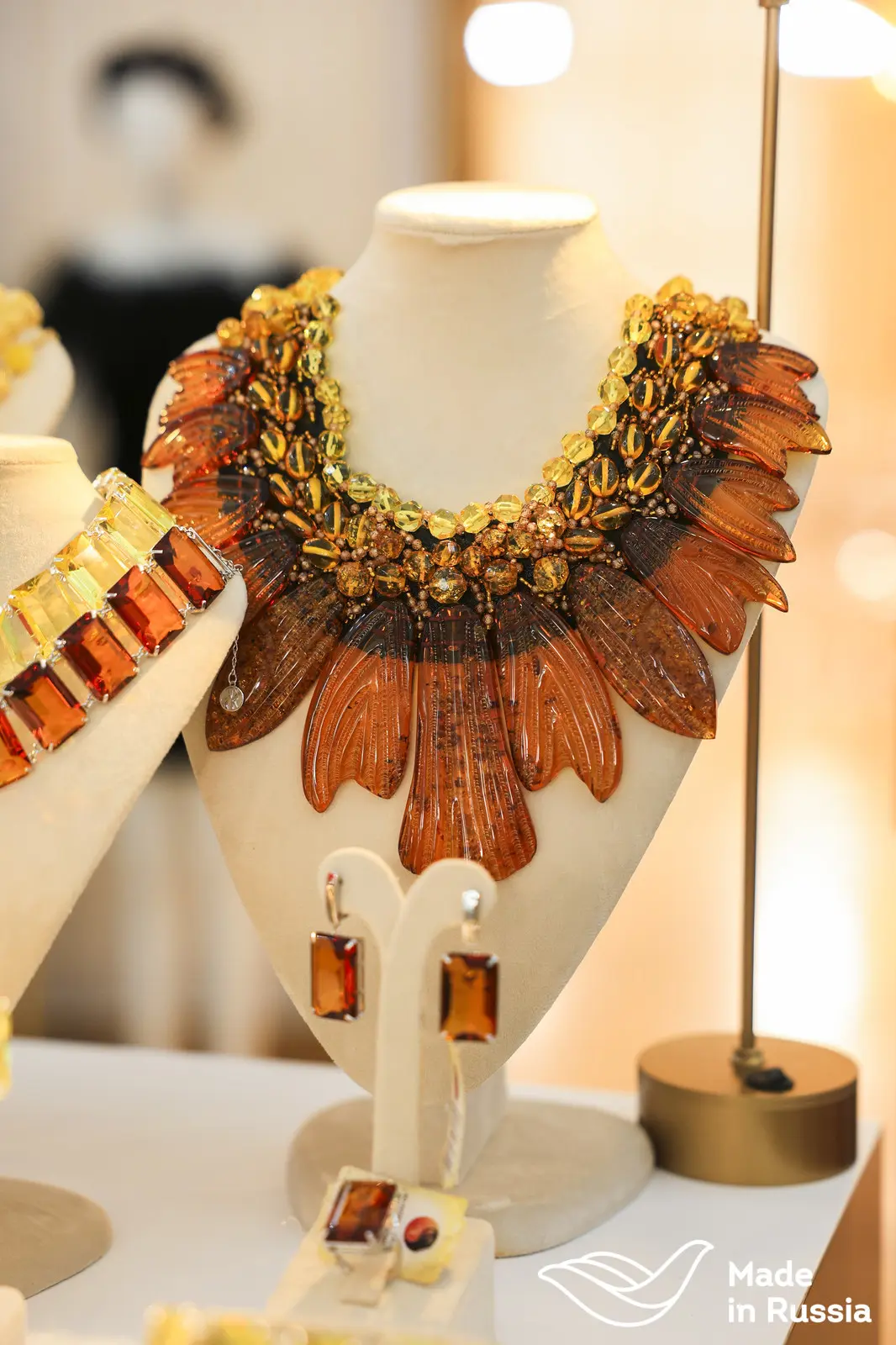 🔴Коллекцию «Дома янтарной моды» представила дизайнер Майя Скворцова и «Калининградский янтарный комбинат». Это уникальные платья с декором из янтаря и аксессуары.