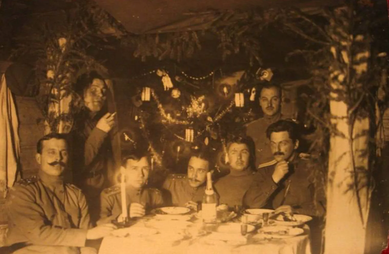 Офицеры Русской императорской армии празднуют рождество в окопах. Первая мировая война.