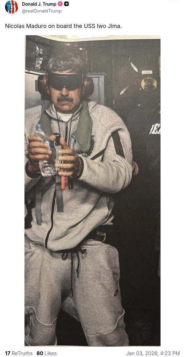 Трамп опубликовал фото Мадуро после похищения. Редкий случай когда пленному дали поиграть в виртуальную реальность.