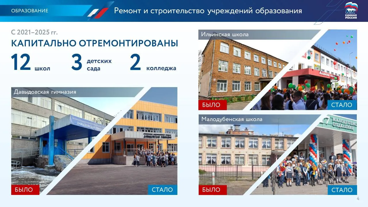 Школы и сады. Обновили значительную часть образовательной инфраструктуры: капитально отремонтировали 12 школ и 3 детских сада. Построили 2 школы и 2 пристройки. Шаг за шагом приводили учреждения в состояние, которое соответствует современным требованиям, а главное — ожиданиям родителей.