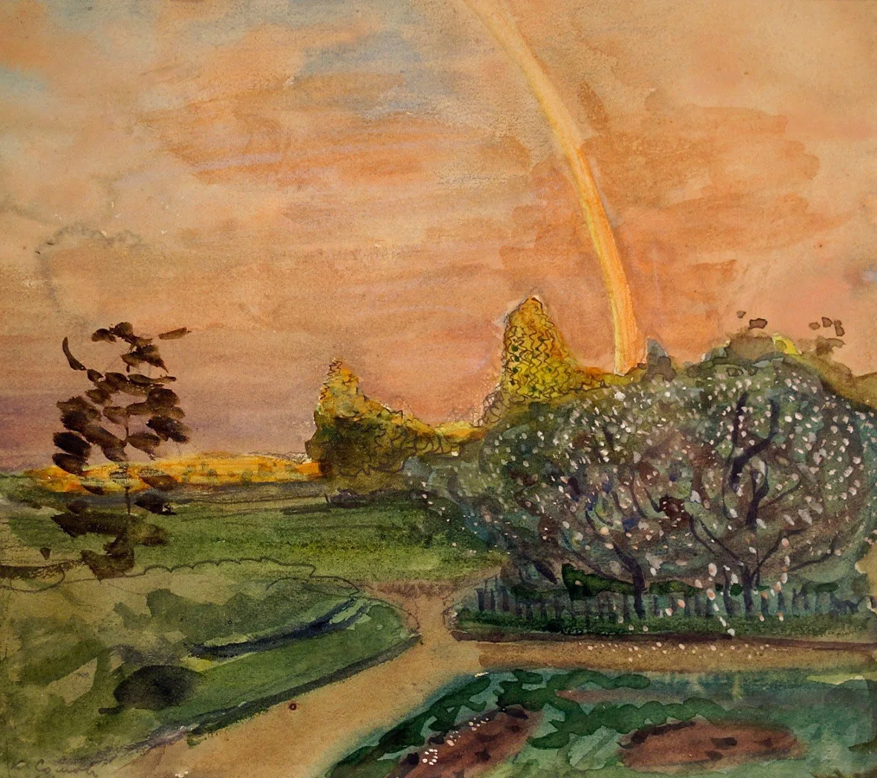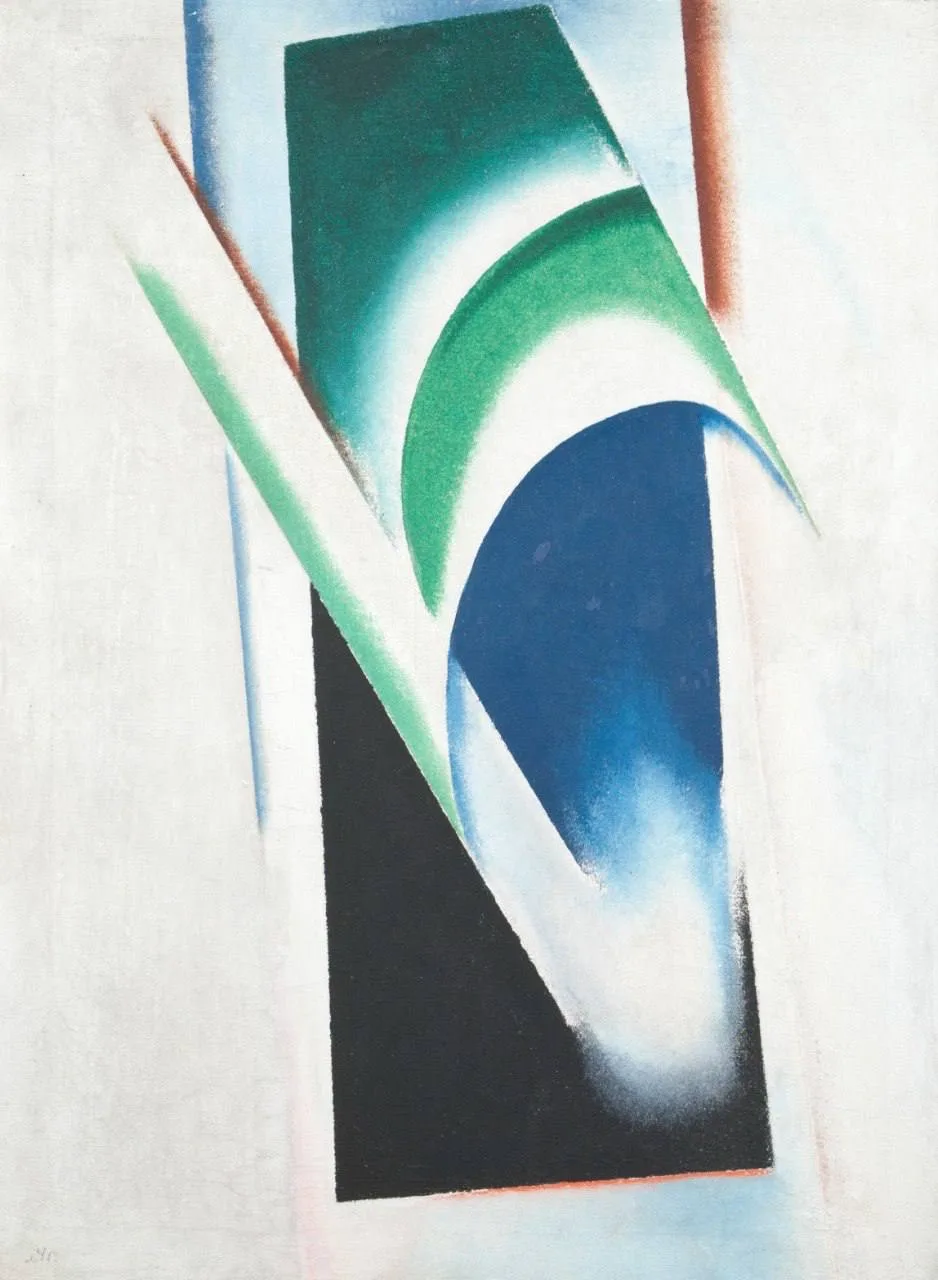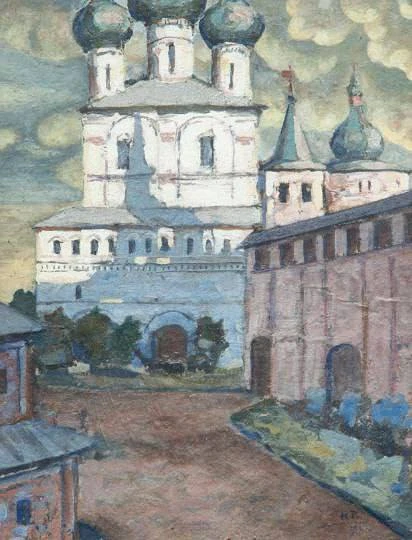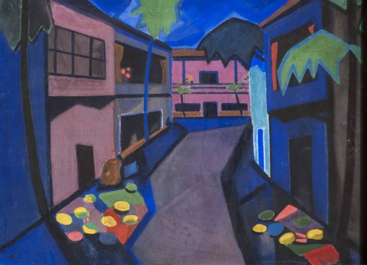 🟢 «Пейзаж» (начало 1910-х годов) переносит в загадочный восточный город. Сине-лиловая палитра, контрасты красного и жёлтого создают минорное, чуть призрачное настроение. Здесь слышатся и народные мотивы, и ориентализм.
