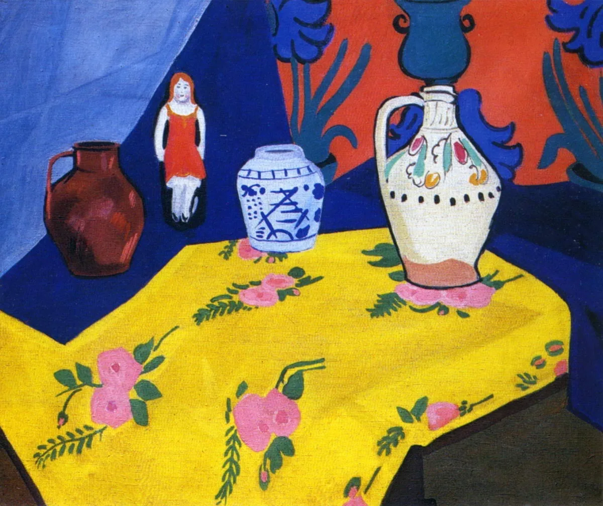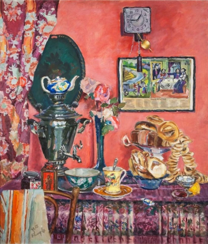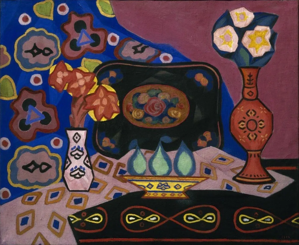 🟡 «Натюрморт с жёлтой скатертью» (начало 1910-х годов) и «Натюрморт с вазами» (1912) показывают художника как тонкого колориста, увлечённого декоративностью и народным искусством.