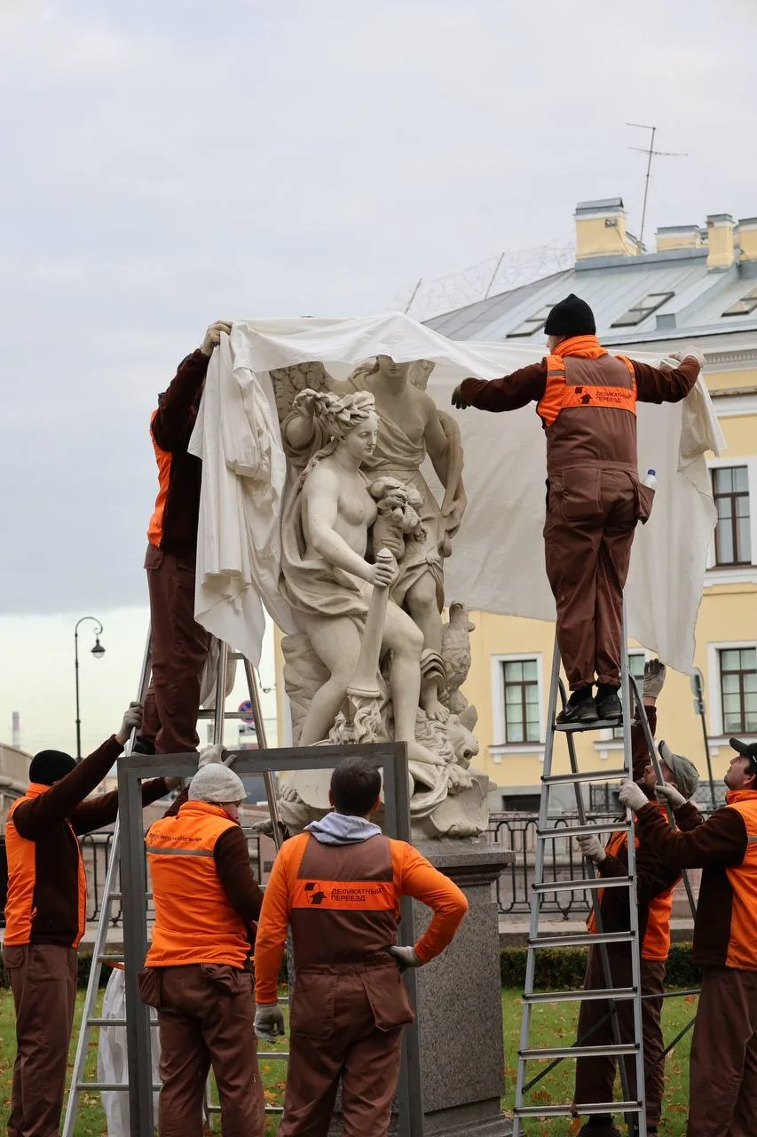 По традиции подготовка скульптур к осенне-зимнему сезону начинается с укрытия аллегории «Мир и Победа» («Ништадтский мир»), выполненной в 1722–1723 годах Пьетро Бараттой.