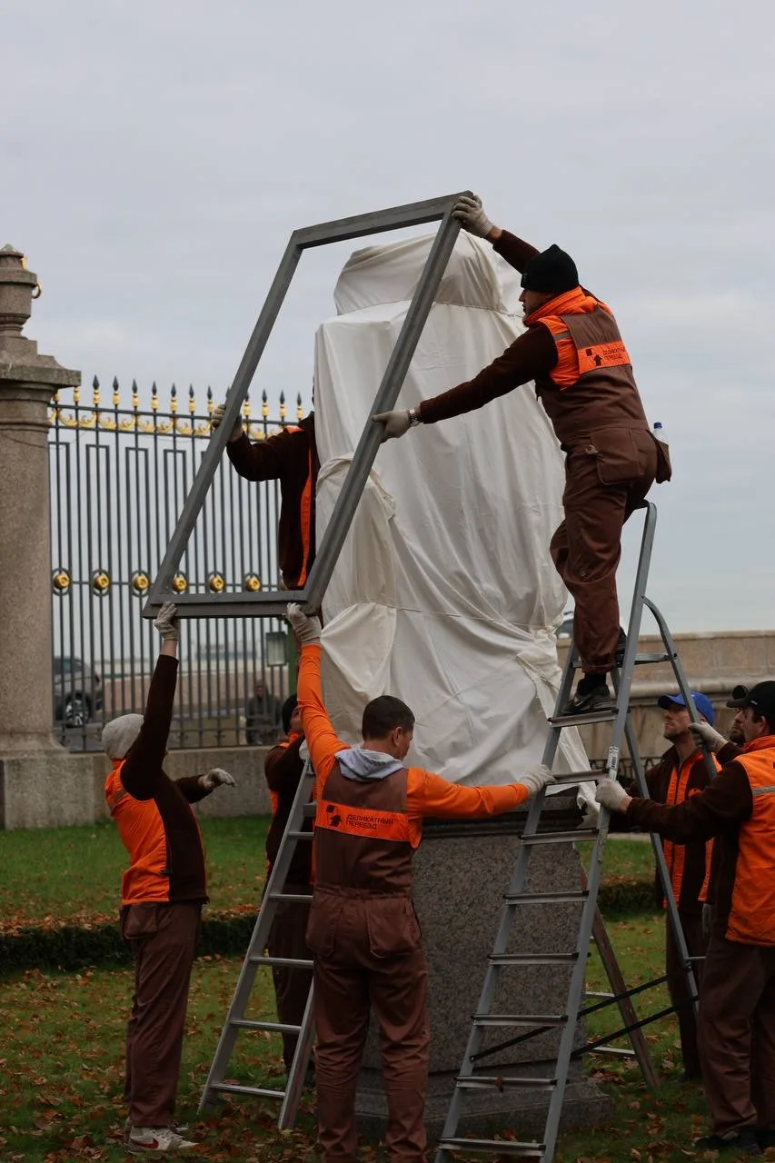 🍂 Делимся кадрами облачения скульптуры в тёплый «наряд» и приглашаем посетить Летний сад в дни золотых листопадов и тёплого осеннего солнца!