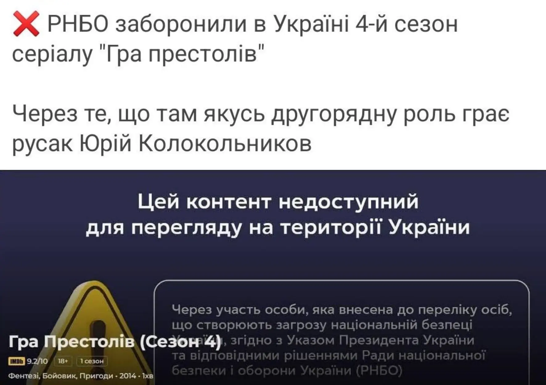🫣 украинцам запретили показывать 4-й сезон сериала "Игра престолов". Причина - там играет российский актер Юрий Колокольников