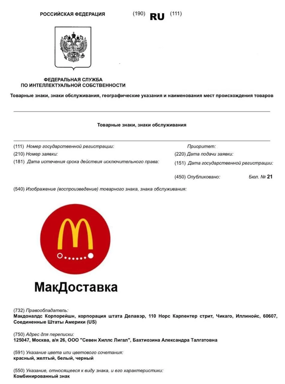 Также бренд закрепил за собой «МакДоставку» — право на использование имени для сервиса доставки еды будет действовать до 2034 года.