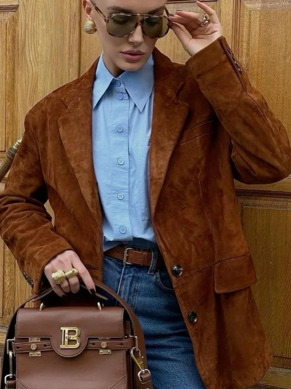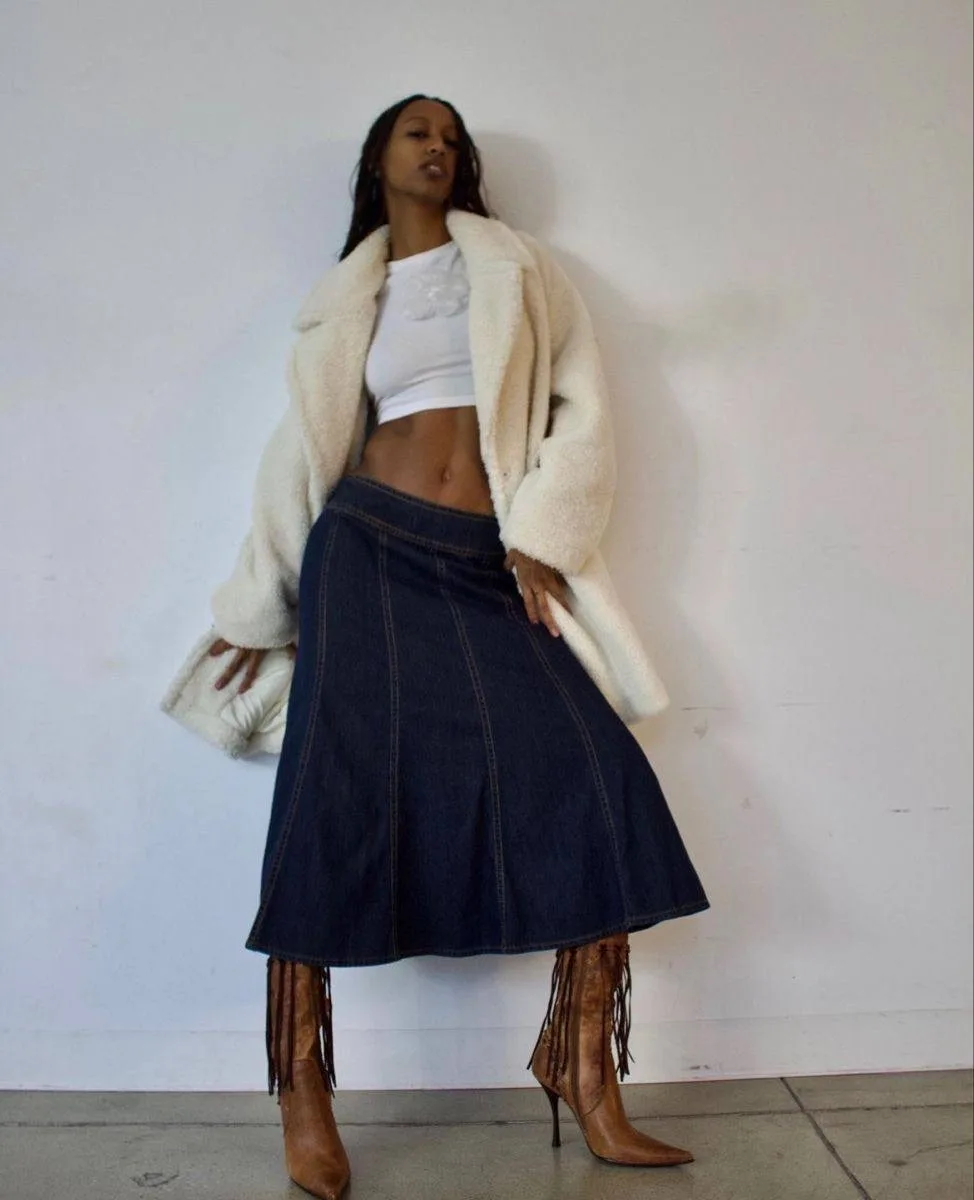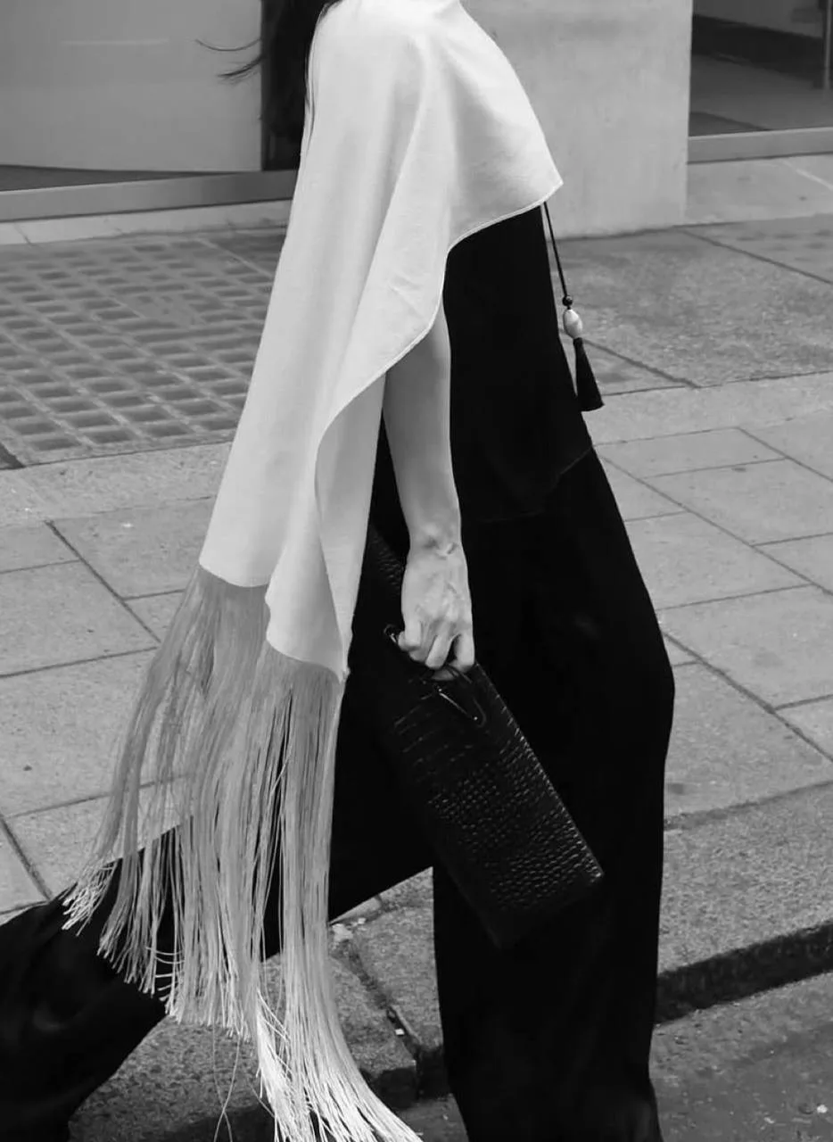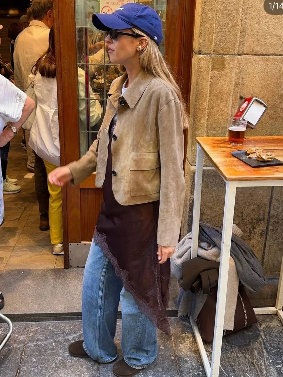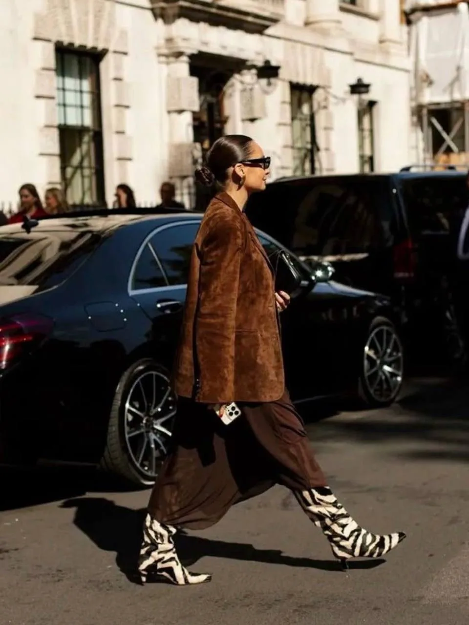 Дальше — дело за деталями: ботильоны с широким голенищем добавляют остроты и уверенности, а пиджак и сумка с бахромой привносят ту самую многослойность и богемный шик, которые сейчас на пике популярности.