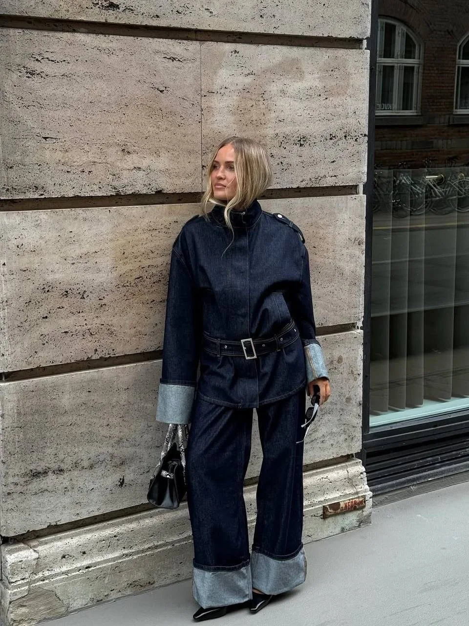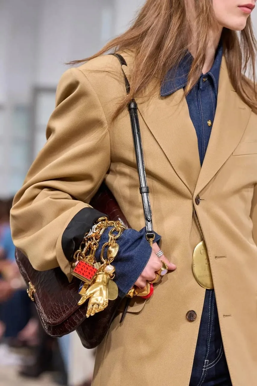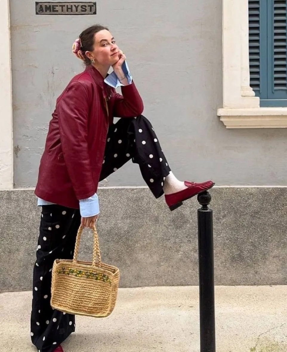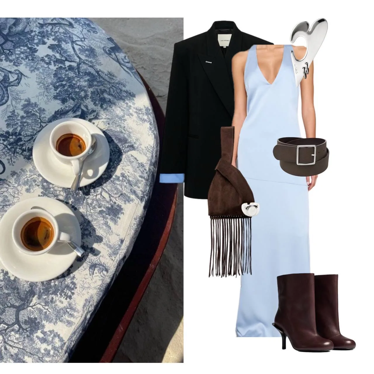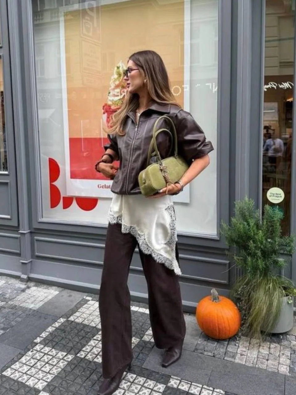 Дальше — дело за деталями: ботильоны с широким голенищем добавляют остроты и уверенности, а пиджак и сумка с бахромой привносят ту самую многослойность и богемный шик, которые сейчас на пике популярности.