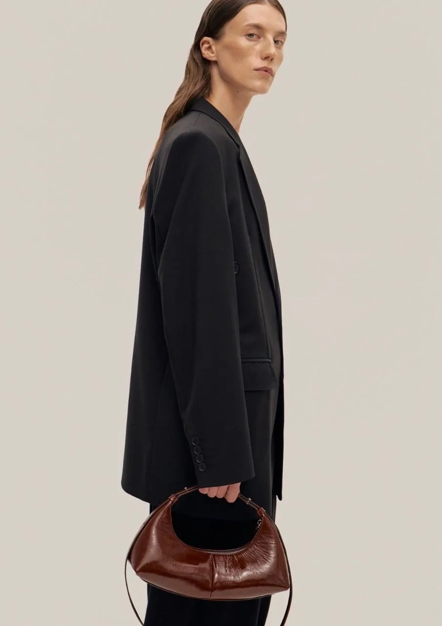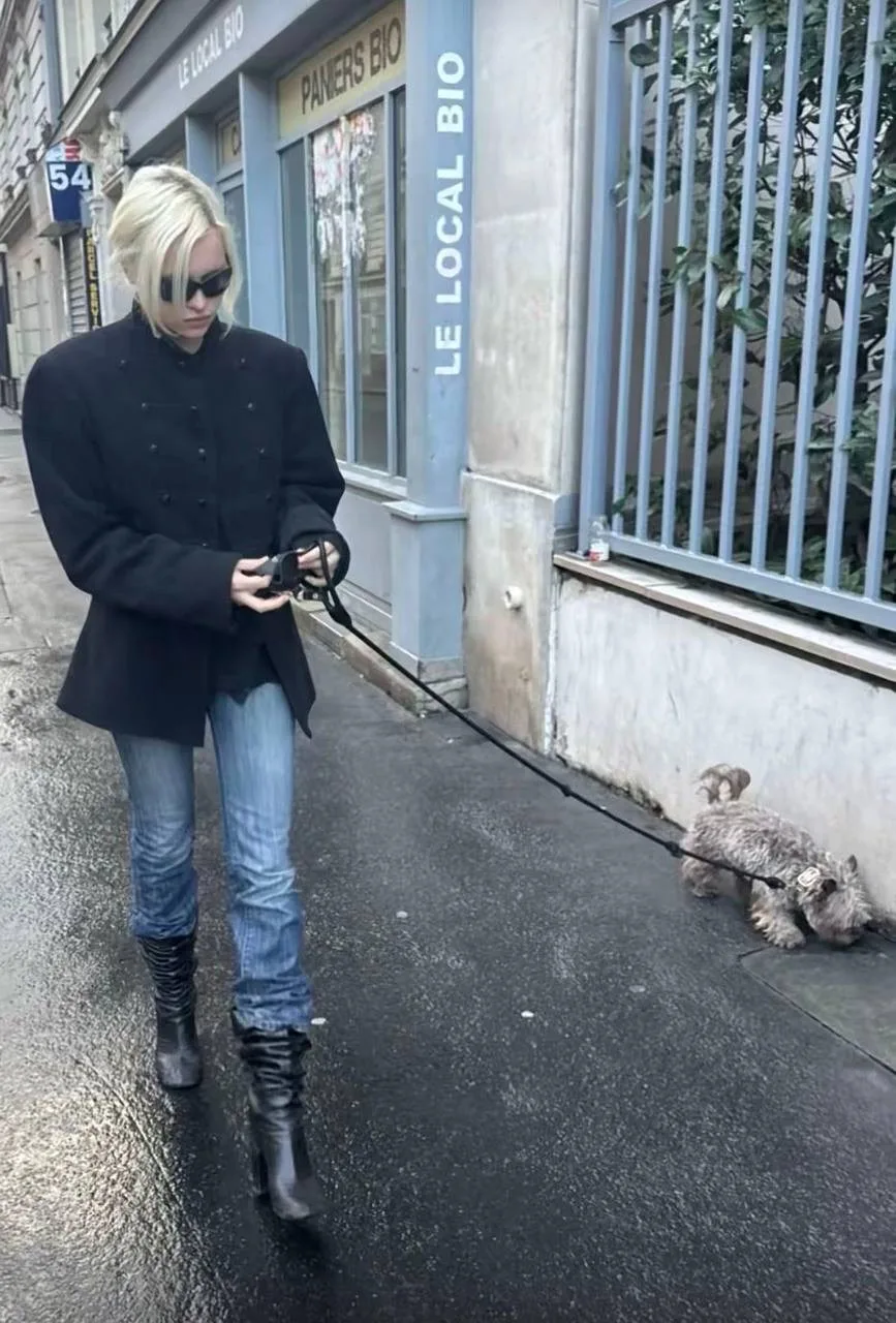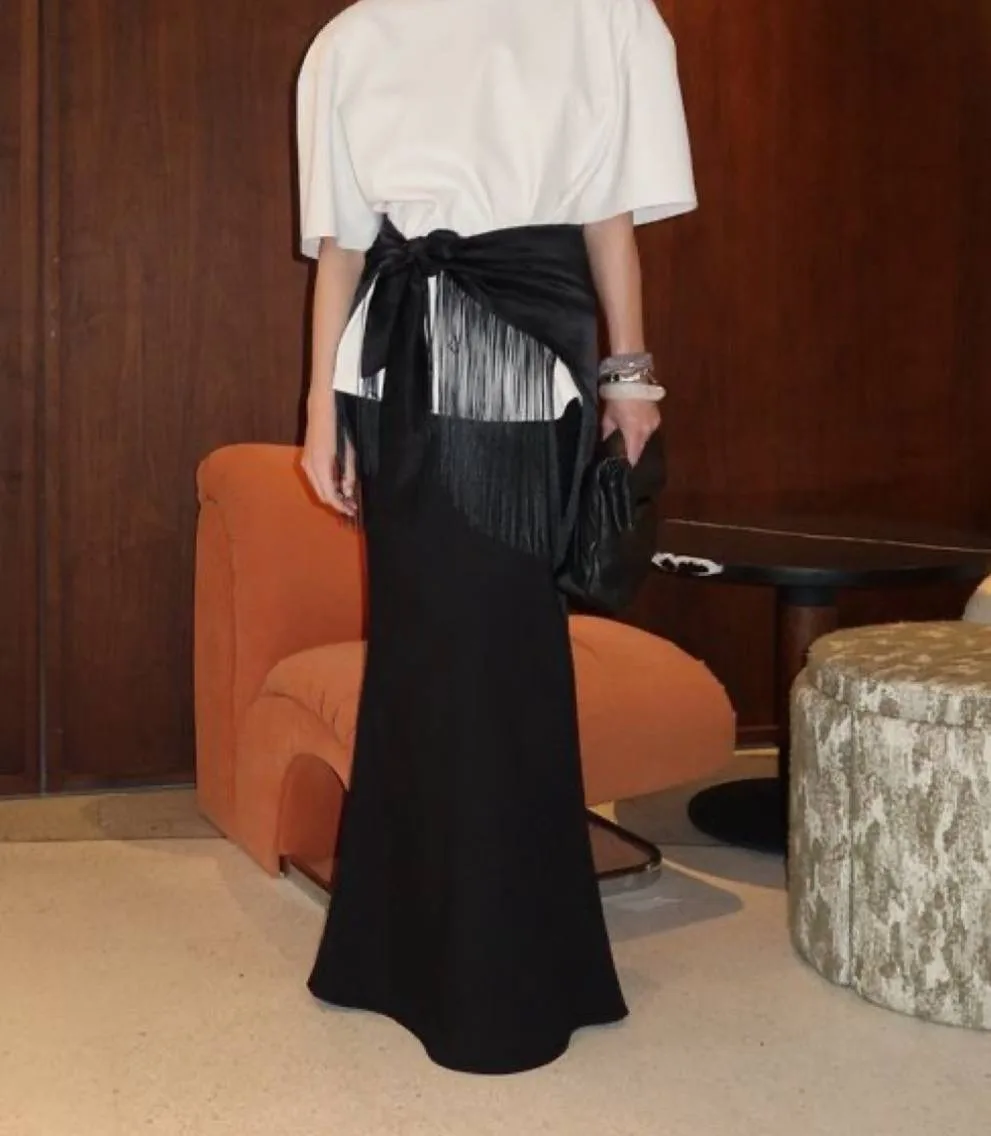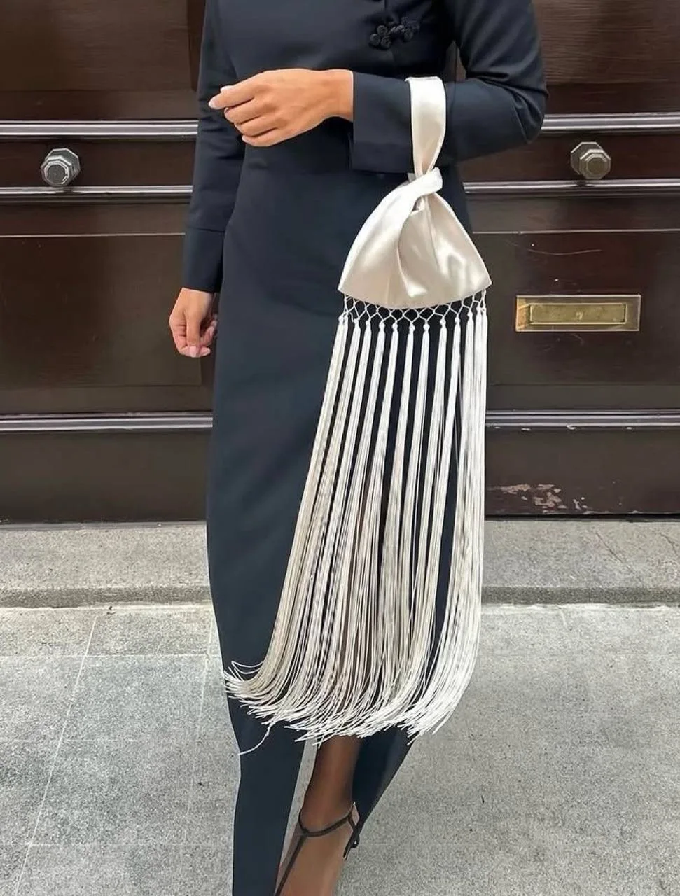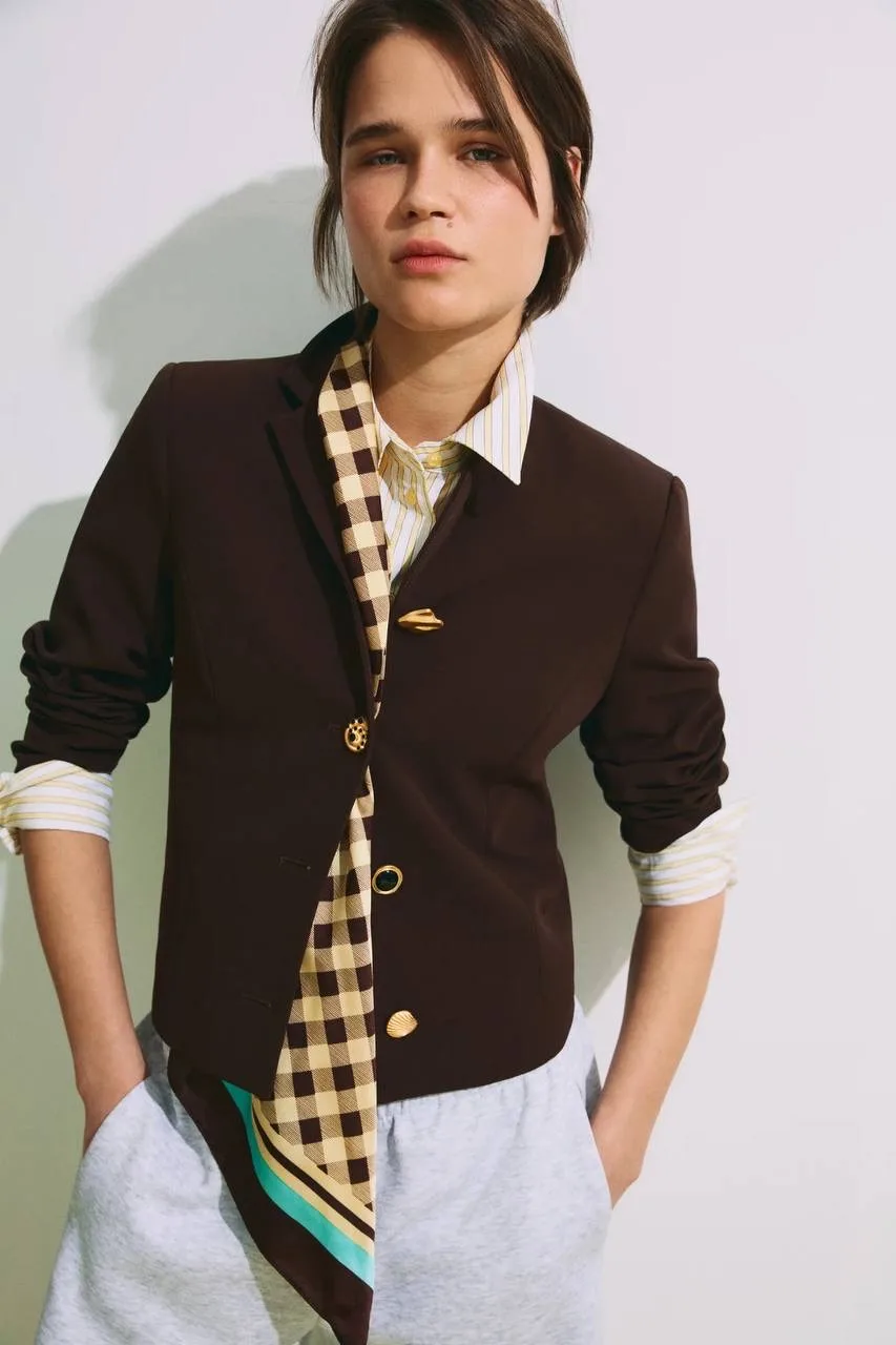 Дальше — дело за деталями: ботильоны с широким голенищем добавляют остроты и уверенности, а пиджак и сумка с бахромой привносят ту самую многослойность и богемный шик, которые сейчас на пике популярности.